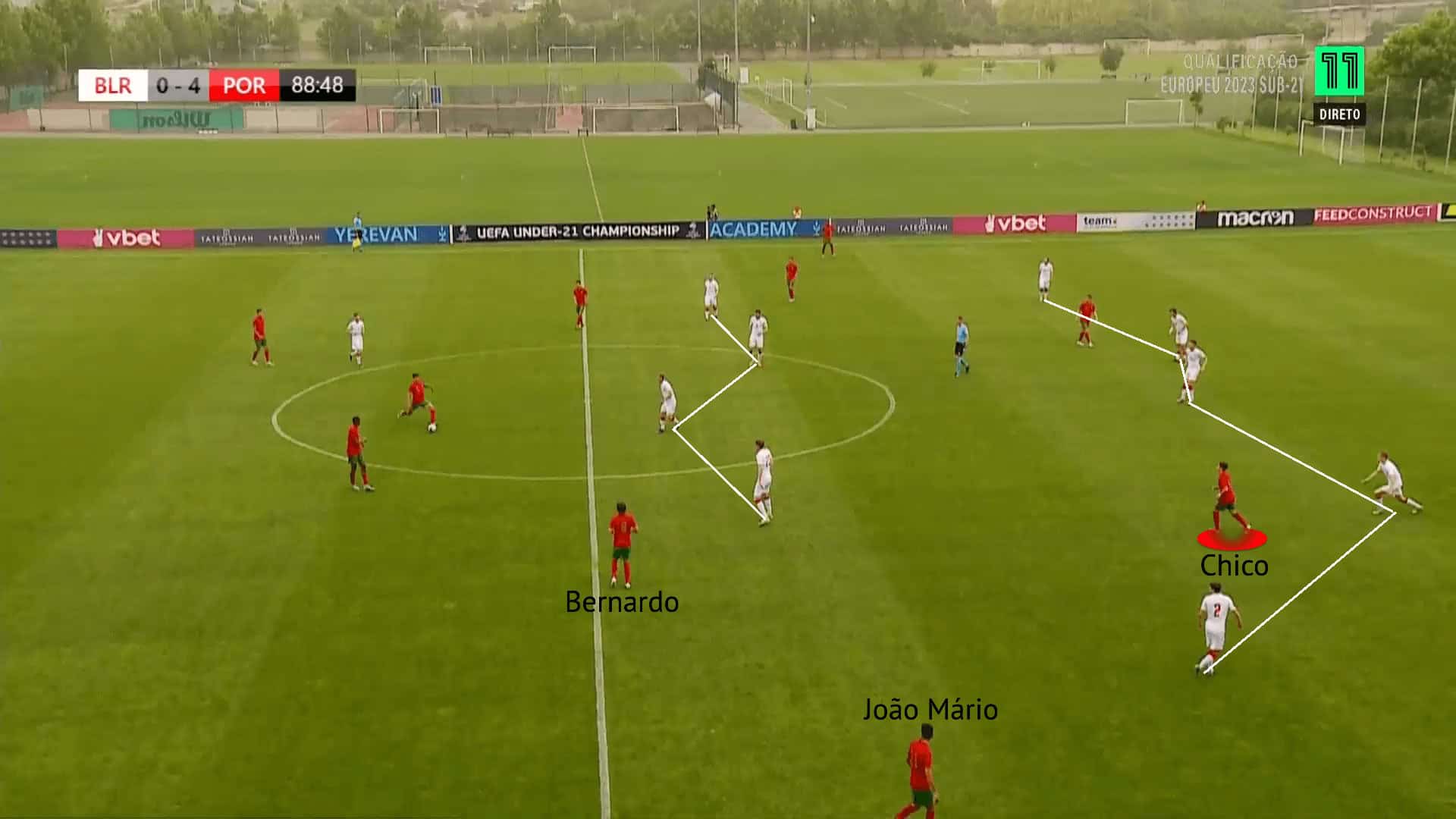With Paulo Bernardo sitting deeper and João Mário holding width, Chico is free to invert and drop between the midfield and defensive line of the Belarusian 5-4-1 defensive shape.