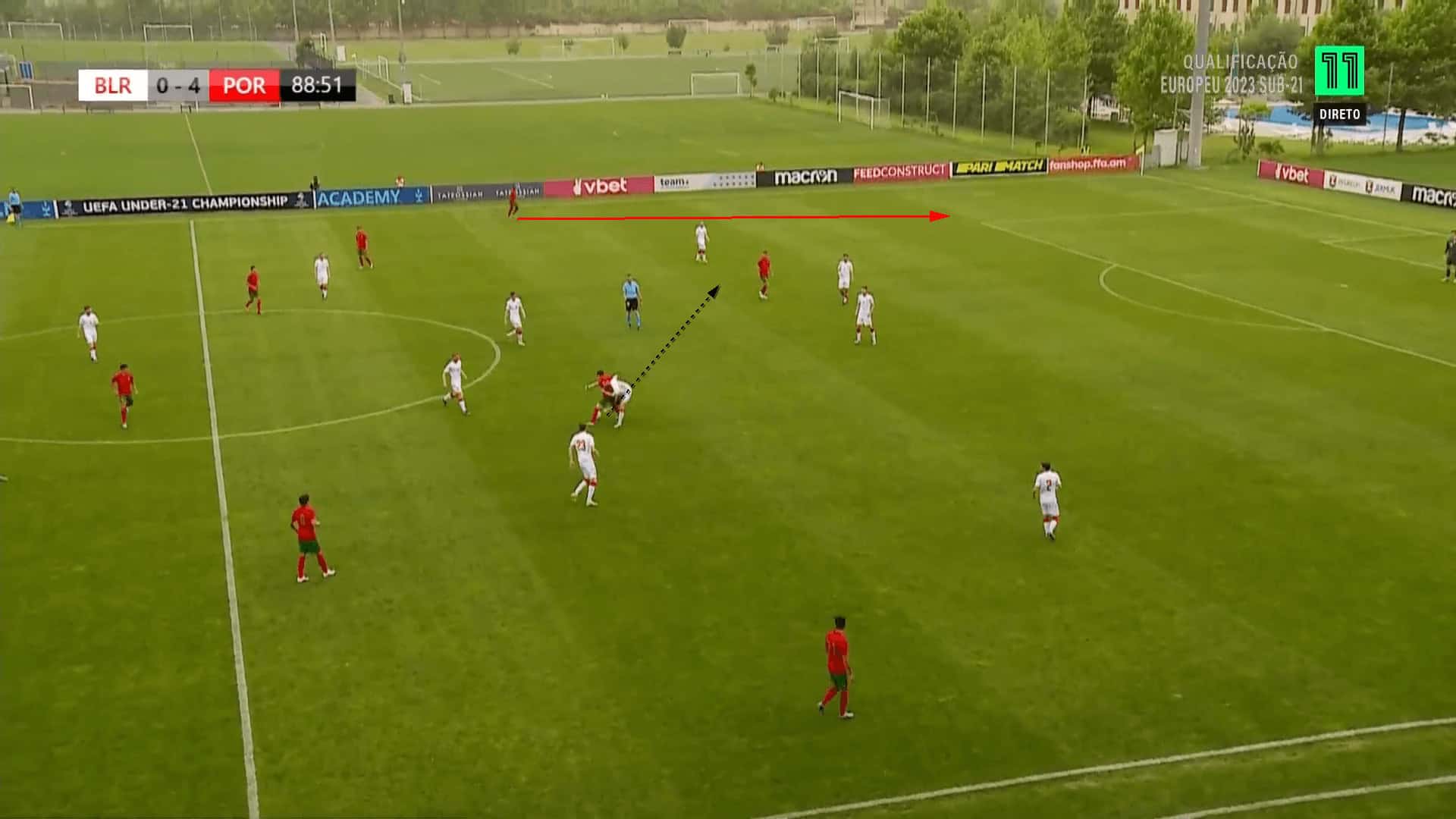 The two images here against Belarus under-21s show a well-rounded example of Conceição’s dribbling efficacy in central areas.