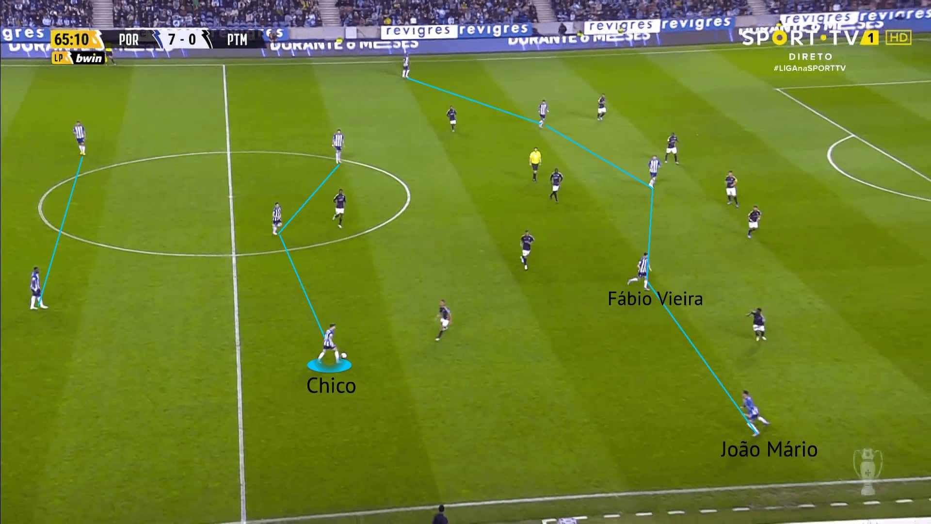 The figure above displays Chico’s tactical discipline to provide balance to Porto’s in possession shape of a 2-3-5.