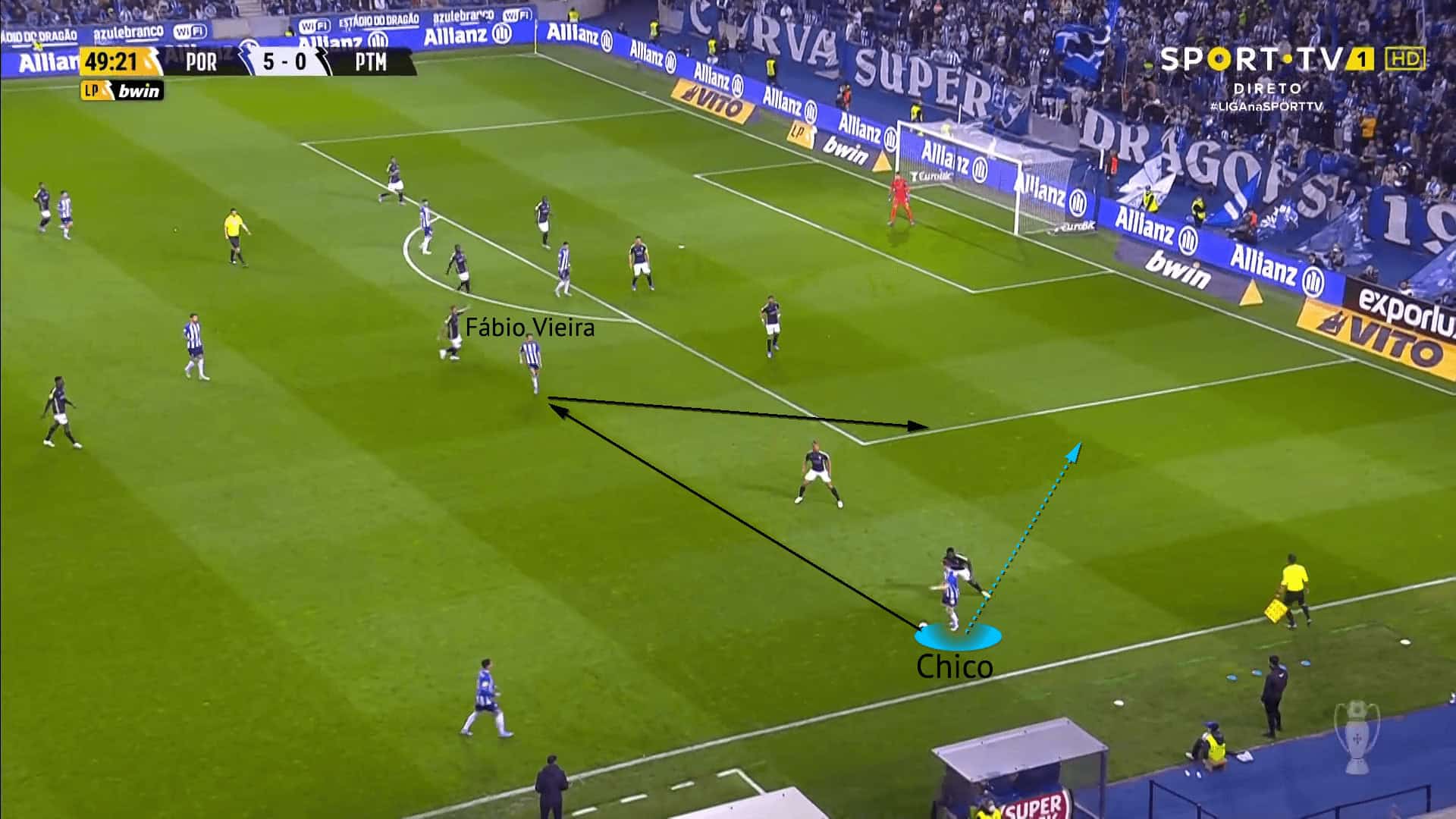 With Porto going 4v4 against the Vizela defence, Chico’s positioning will allow him to receive free or force one of the defenders out of position for either another attacker or João Mário to exploit.