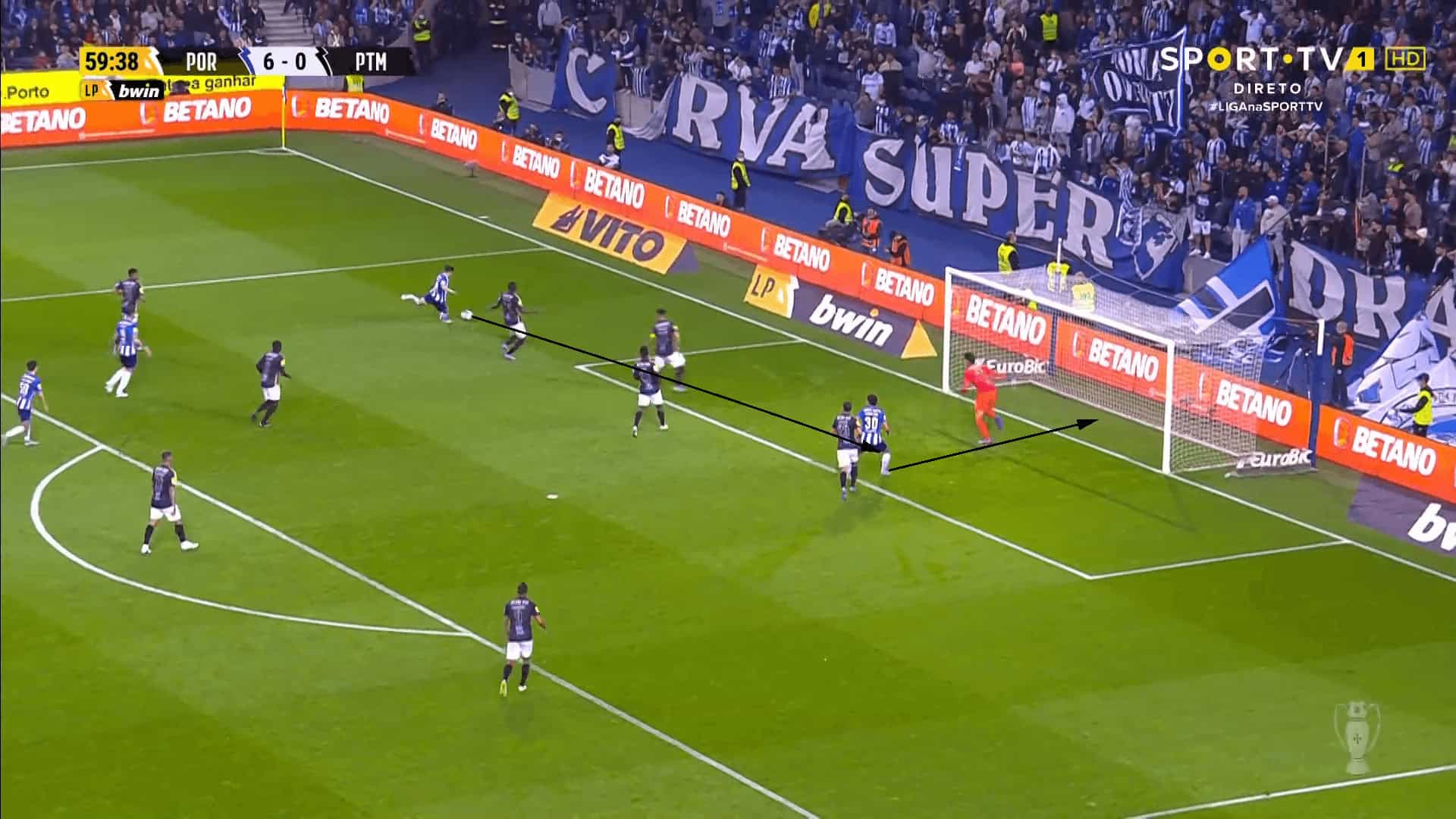 Pointing in behind, Chico makes the penetrative run as centre-back Pepe scans the pitch ahead of him.