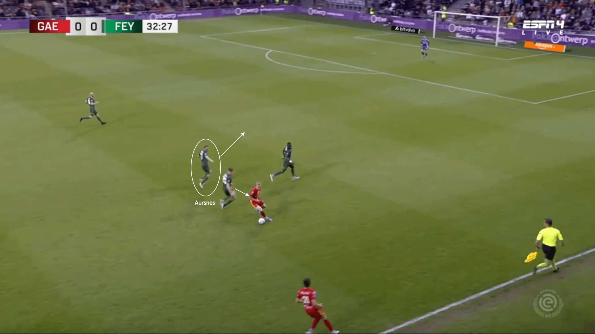 The image above shows an example of the defensive positioning, as well as the work rate that Aursnes has. After Feyenoord turned over possession in the middle third, they were forced to defend against a counterattacking phase of play. Aursnes instructs the defender to step out and engage the player in possession, while he drops into the backline and becomes a makeshift centre-back. This allows Feyenoord to keep their defensive solidity while still pressing the ball-carrier stop the counterattack threat.