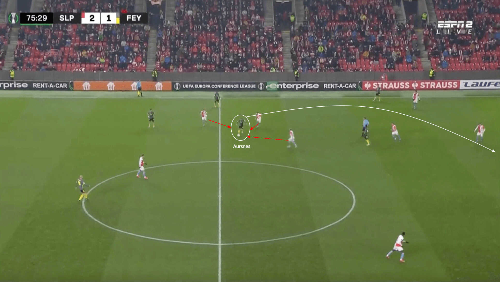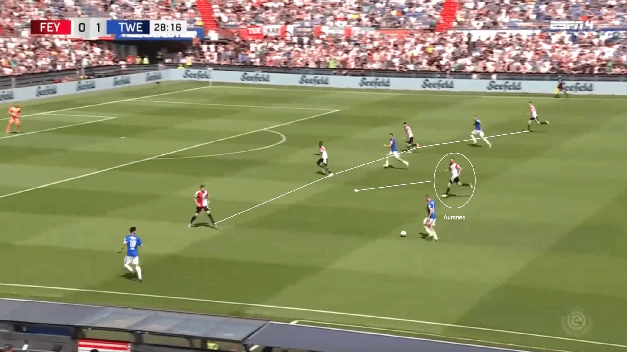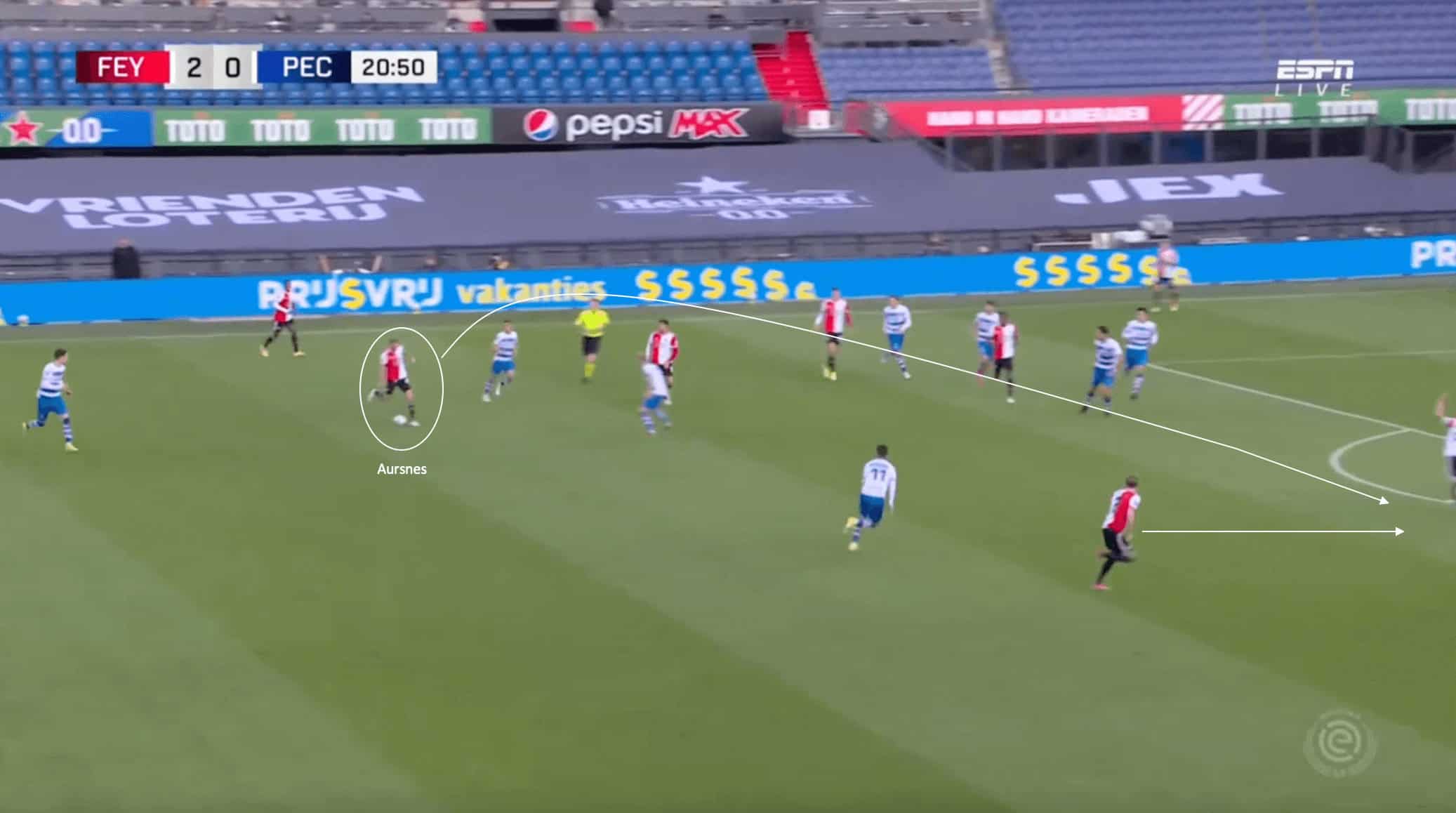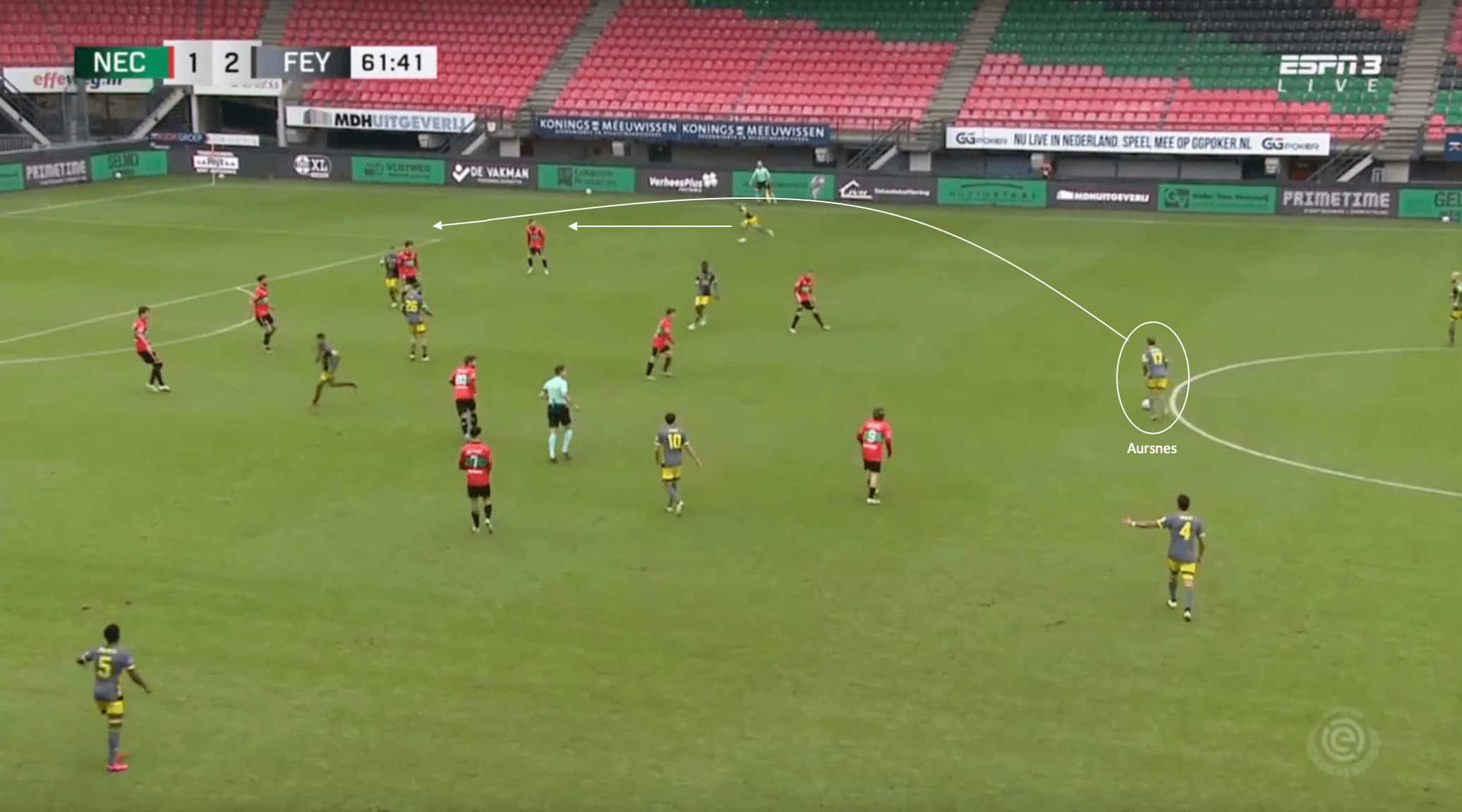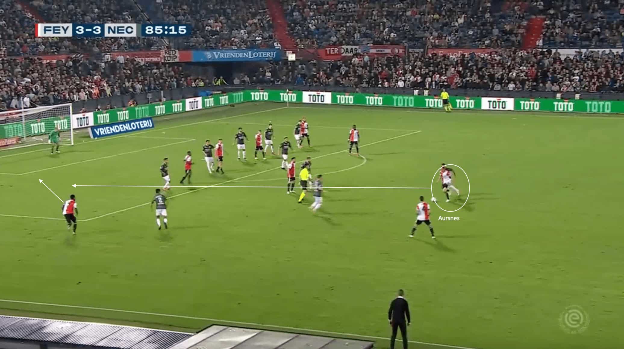 This ability of Aursnes to drop the ball into these pockets of space shows the value that he offers to this Feyenoord team. He is able to control the play for the Eredivisie side, whether he is in the attacking third, middle third, or even his own defensive third.
