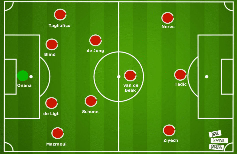 In 2018/19, Ajax lined up in a 4-2-3-1 with Donny van de Beek as an attacking midfielder and Frenkie de Jong partnered by Lasse Schone in the midfield pivot.