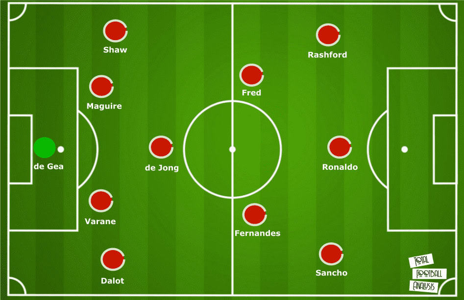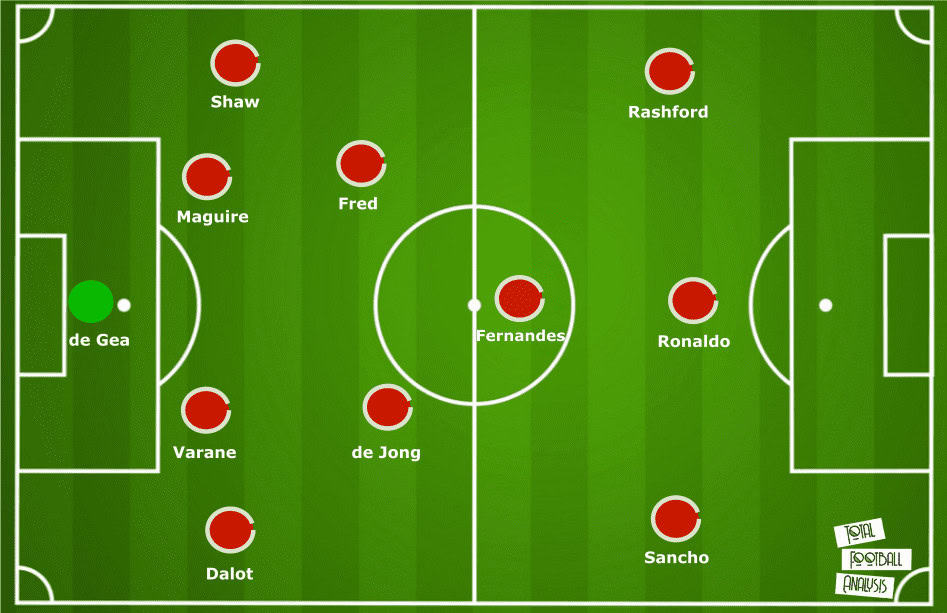 This 4-2-3-1 system can be replicated at United with either Fred or Scott McTominay alongside de Jong. Fernandes or van de Beek will compete for the attacking midfield spot. It is likely ten Hag will set up this way as it better suits the players’ profiles and strengths.
