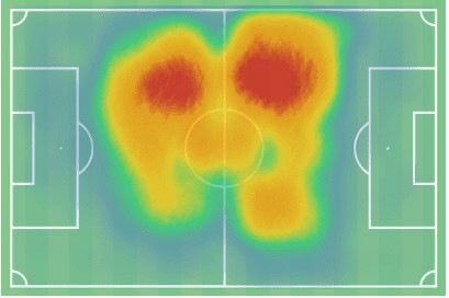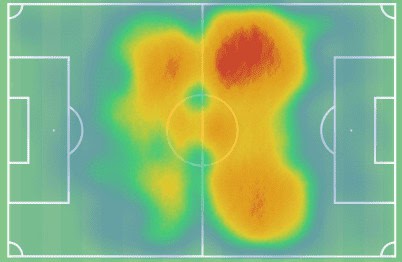 Comparing this heatmap to the Ajax one, it is evident how de Jong’s influence in the mid and final third has increased while his impact in the build-up phase in and around the defenders has diminished.