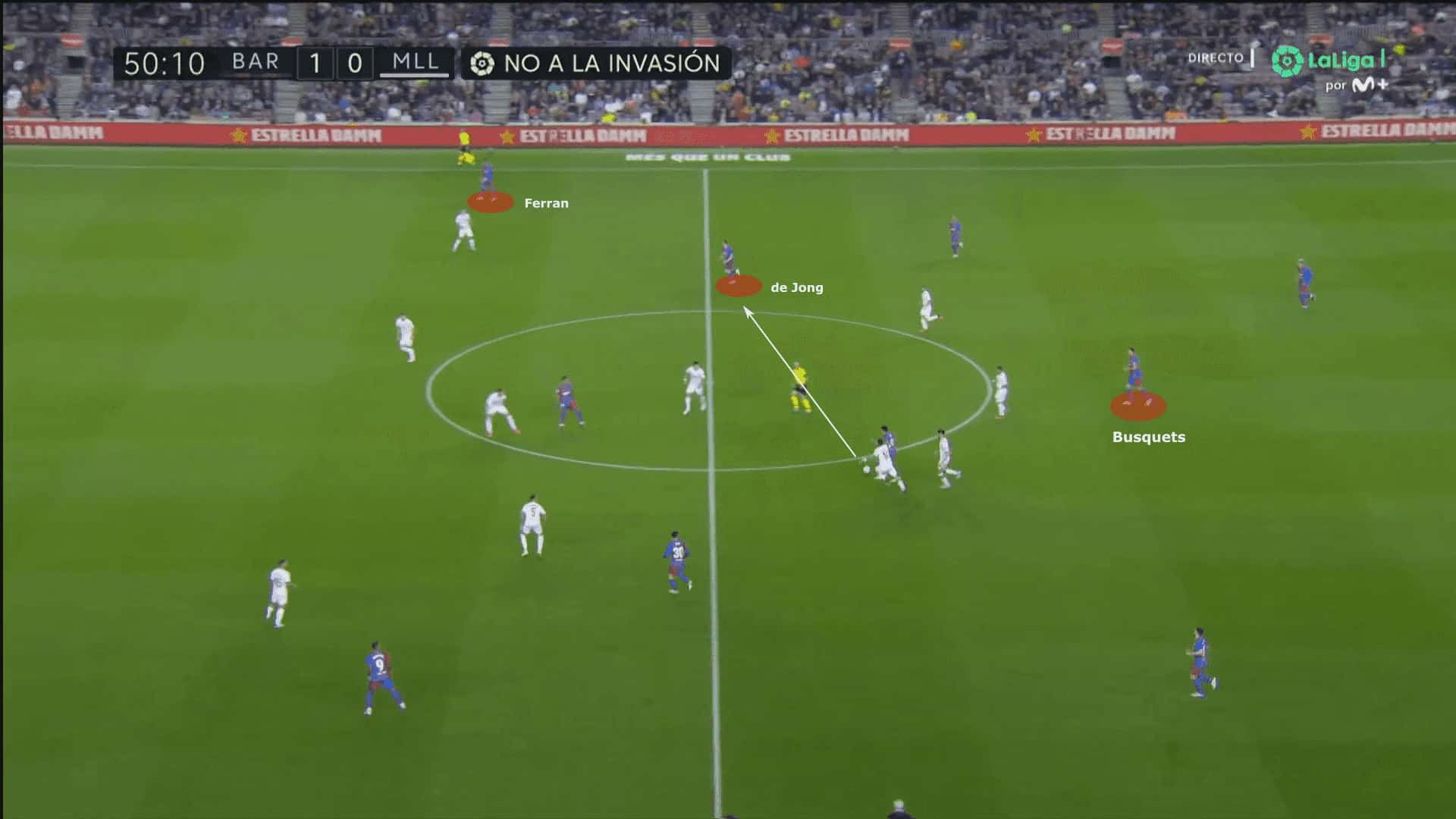De Jong is mostly situated around the halfway line looking to be on the end of the line-breaking passes rather than being the one supplying them – Busquets is tasked with that role.