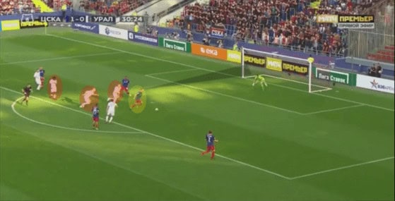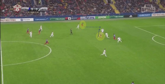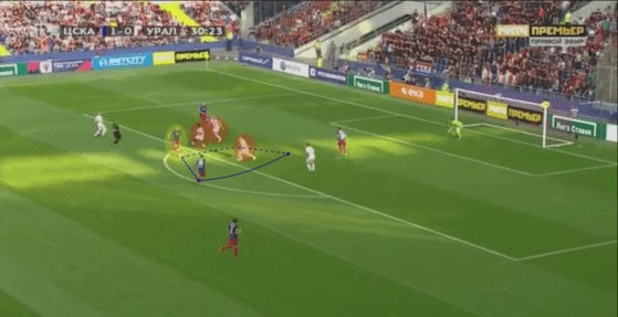 With the route to progress with the ball blocked off by the opponent’s defenders, Chalov plays a one-two with a teammate on the edge of the box. The defenders follow the ball, allowing him to get behind their line and receive again.