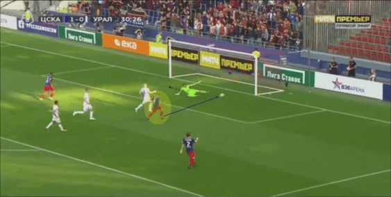 Aside from being clinical with his chances, Chalov also has an element of subtlety to his finishing. He often waits intelligently for the goalkeeper to dive before passing into the opposite corner of the net. The goal illustrated below highlights an occasion where the youngster did just that.