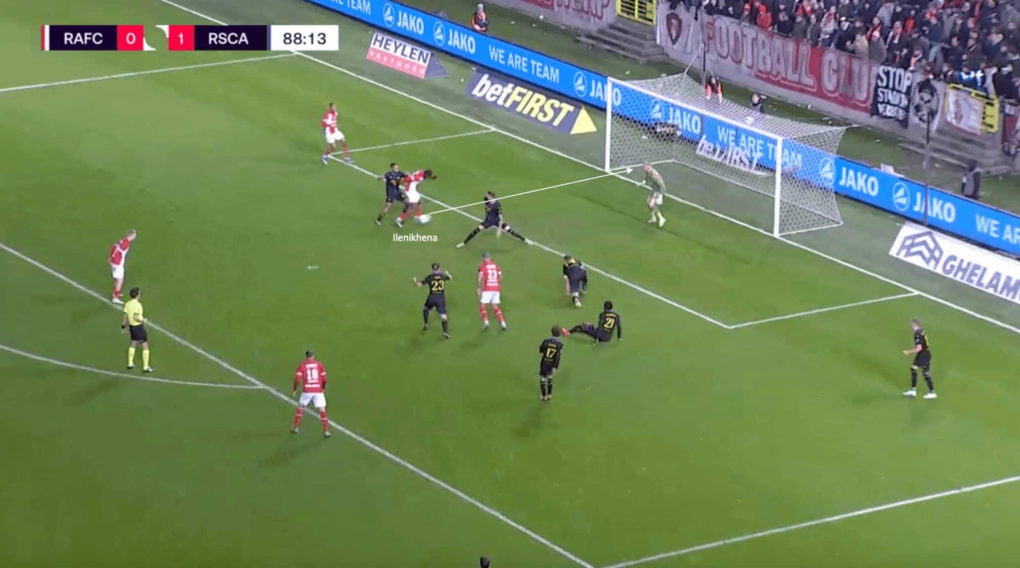 In this first image, we can see that Ilenikhena is positioning himself at the back post area, with him able to find some space between the Anderlecht fullback and centre-back, with the key being that he is goal side of the fullback, with the centre-back in front of him unaware of his presence on the back post.