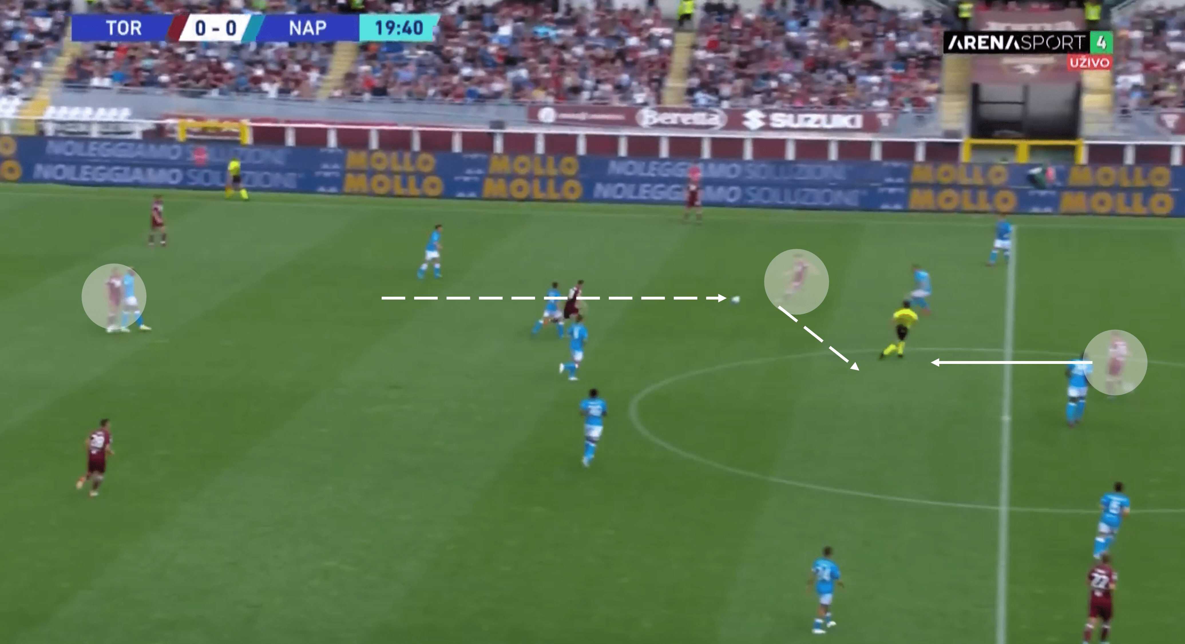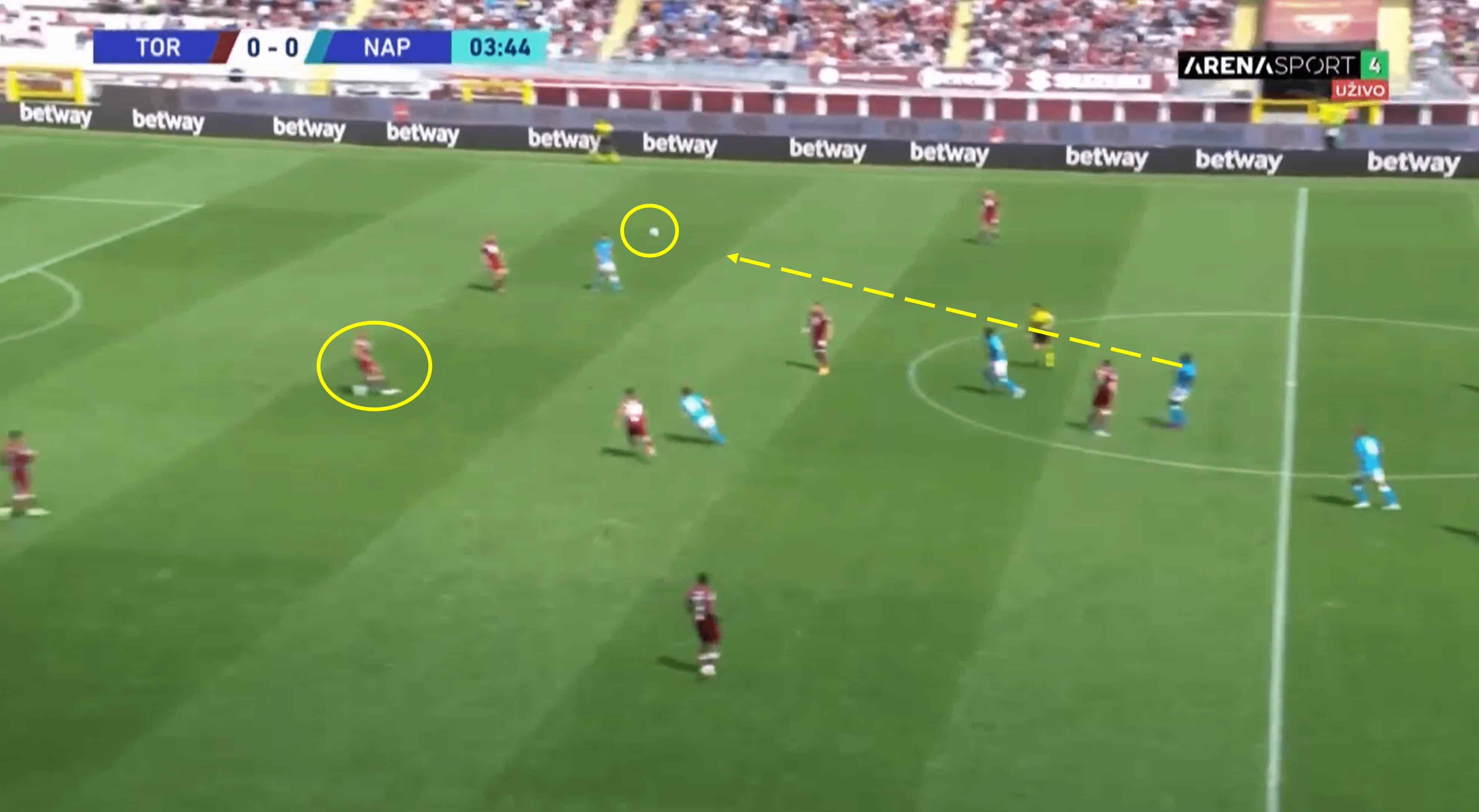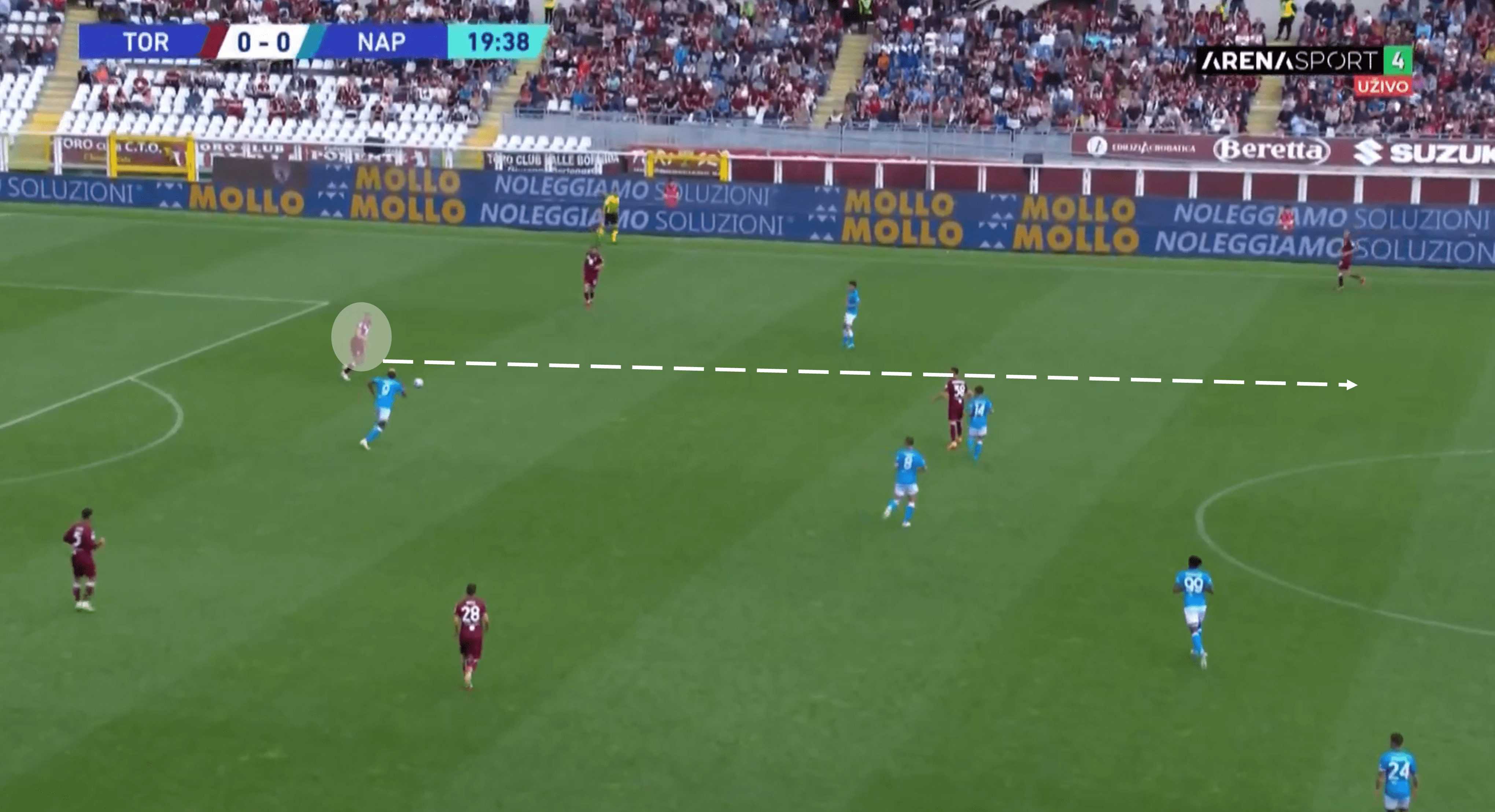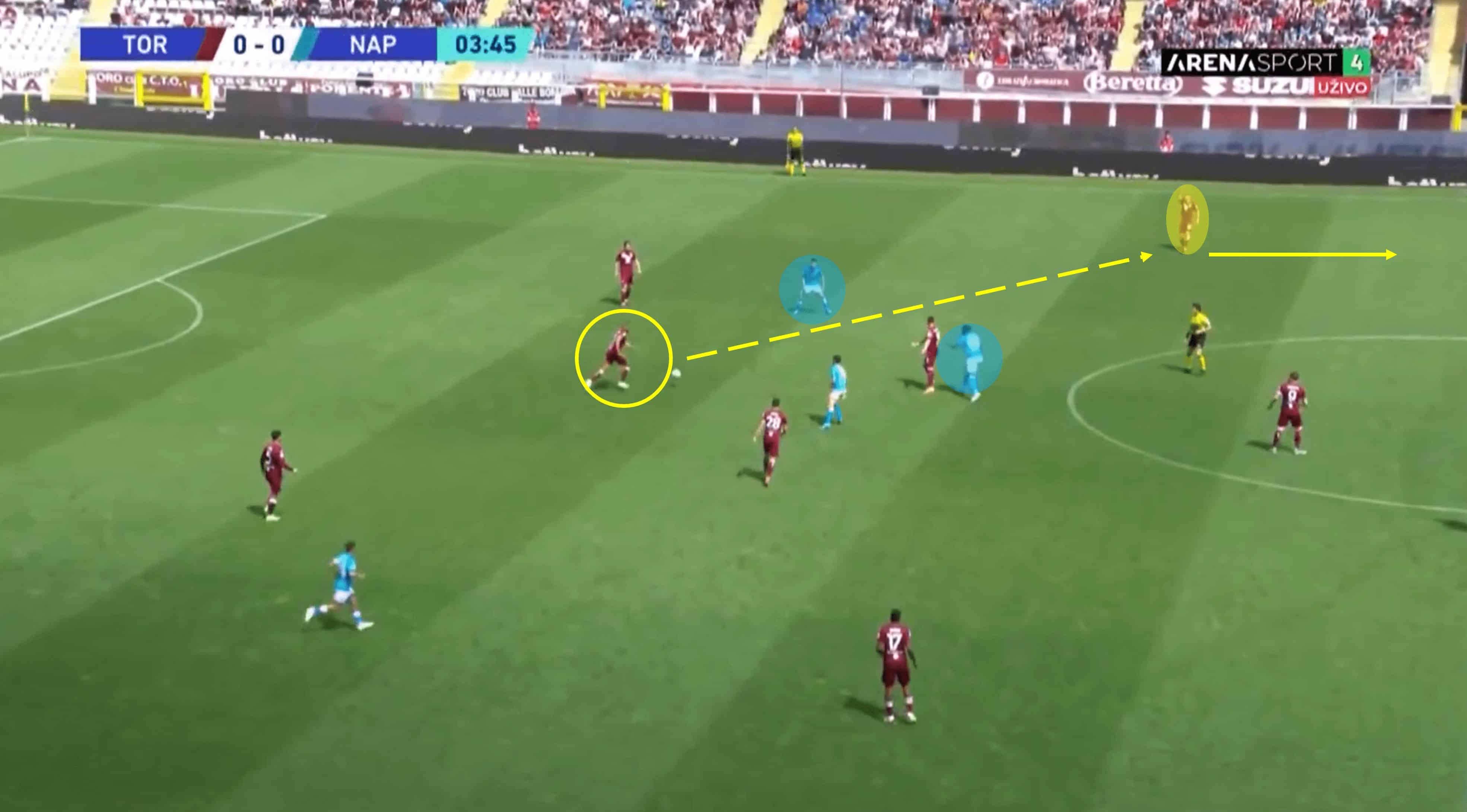 This next analysis shows Bremer’s ability to play effective passes that break lines and, again, puts his team in a position to launch a quick attack. Bremer, highlighted on the left in the first of the two images, has easy passing options all around him but opts for the more productive pass that bypasses a number of Napoli players.