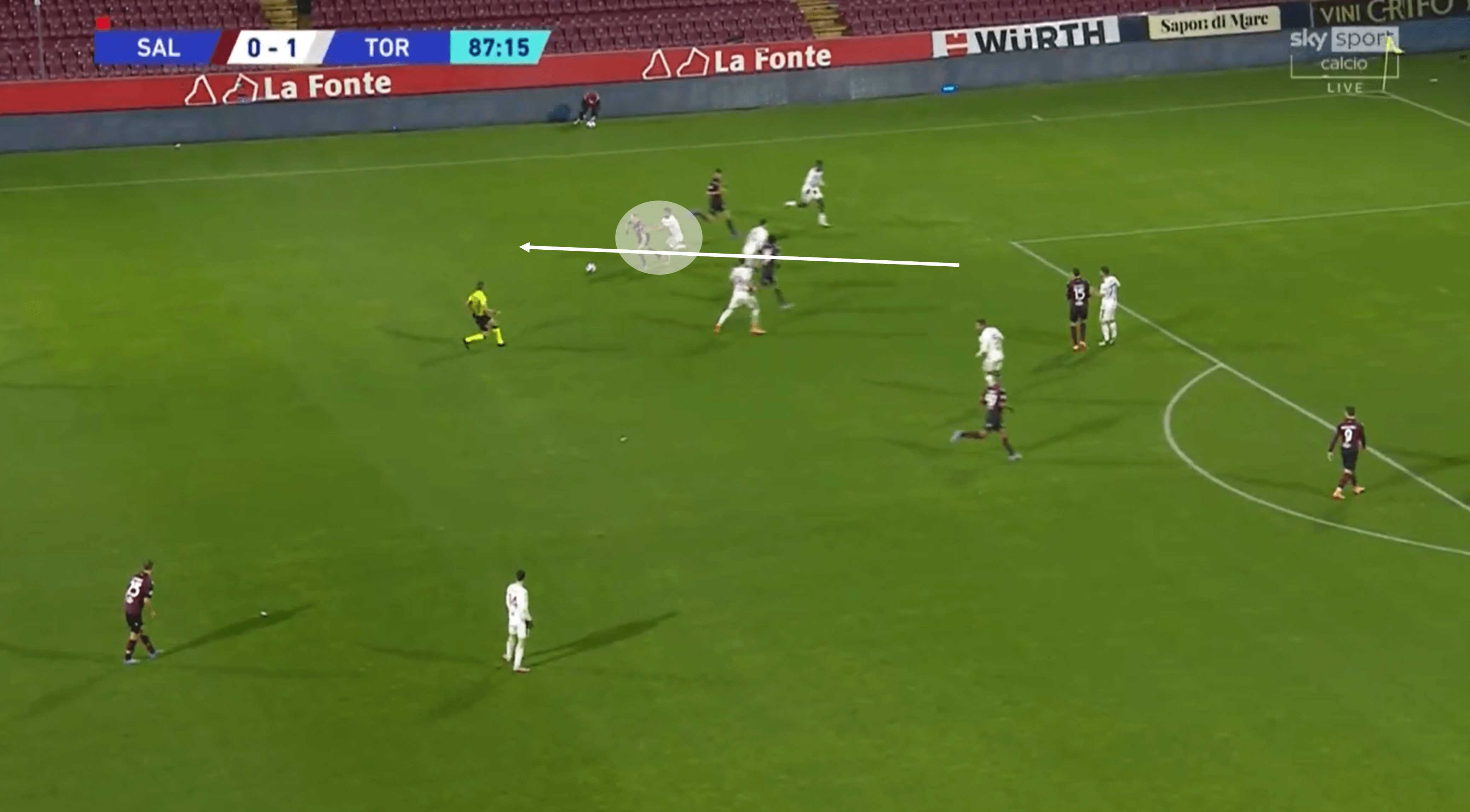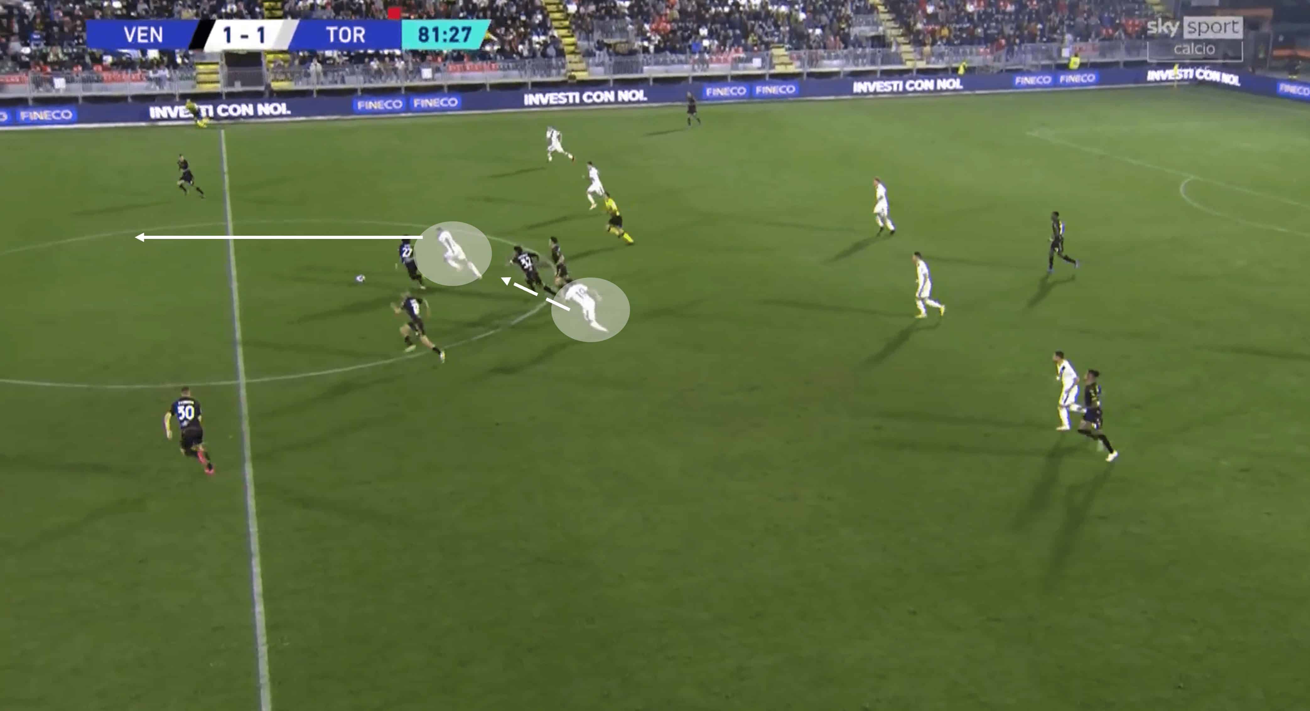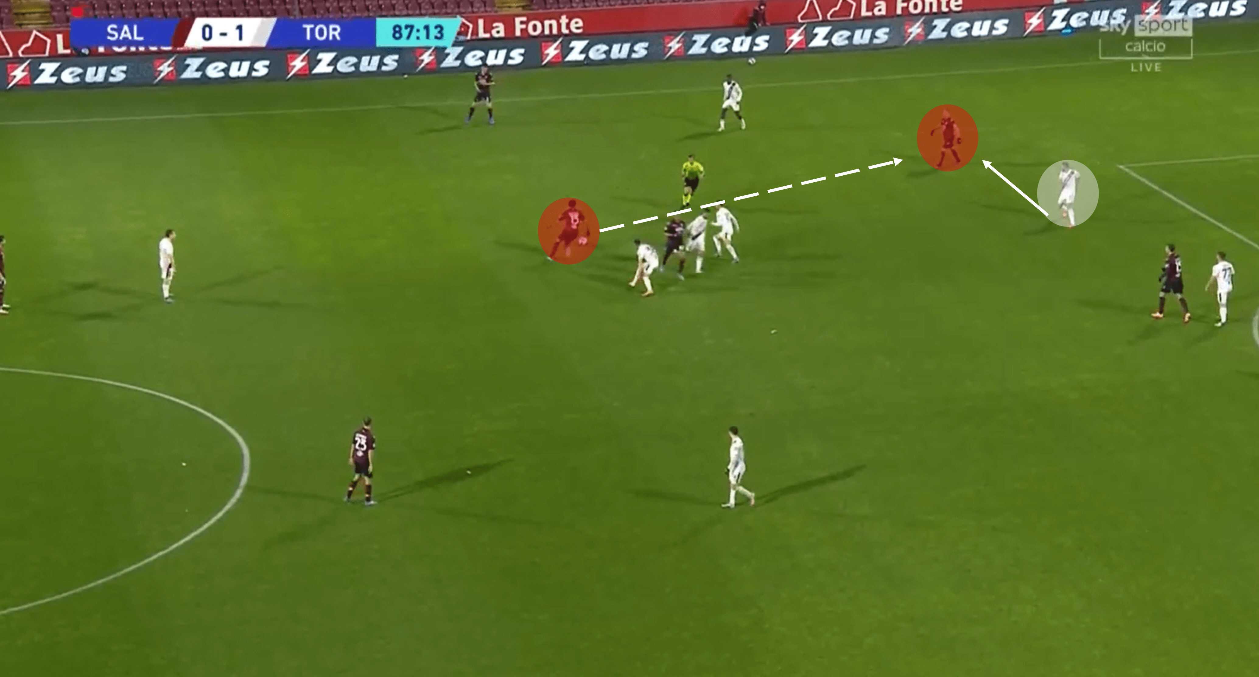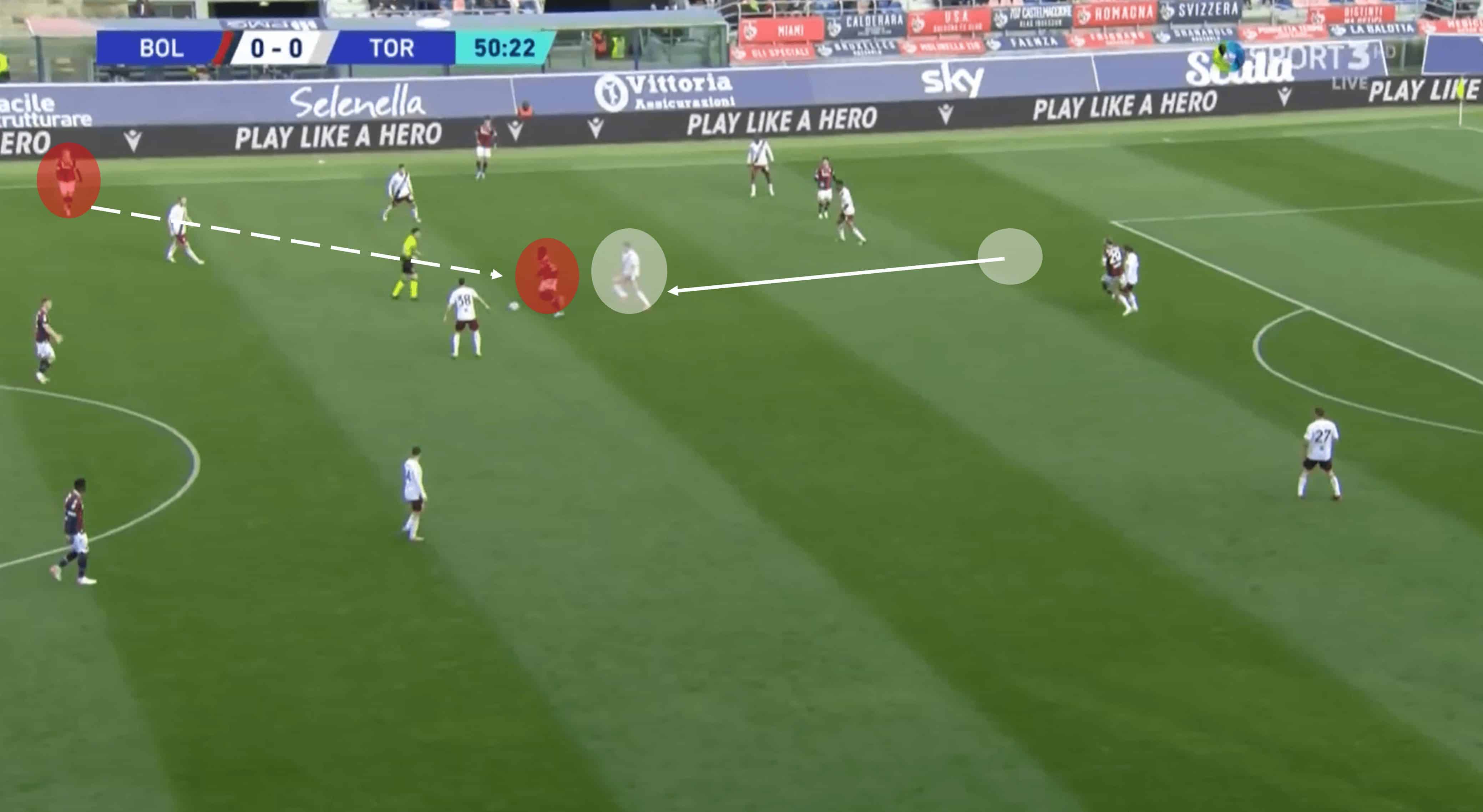 Here, we see Bremer taking similar action to the previous analysis, just under slightly different circumstances. While it still involves leaving the back-line to apply pressure to the opponent on the ball, it is more central and is done so due to the lack of a deep midfield presence – Torino’s three-at-the-back shape allows for this from Bremer on occasion. Again a good display of several tactical attributes from Bremer, and also showed good speed and reactions in the process.