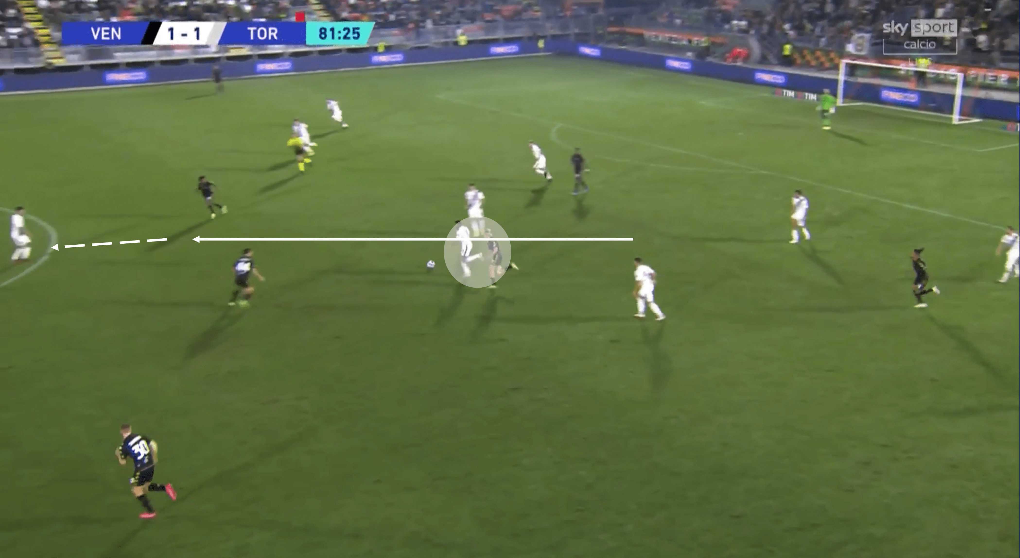 Bremer’s selection of the next pass demonstrates both his confidence and determination to get the ball forward quickly. In the position he receives the ball, many defenders may look to a close-by teammate or back to the goalkeeper for the next pass – Bremer fired a crisp pass into space towards his left midfield. This pass allowed Torino to get up the field quickly and launch an attack rather than simply retaining possession. Bremer brings this quality to the team quite regularly, evidenced by his 88% pass accuracy this season.