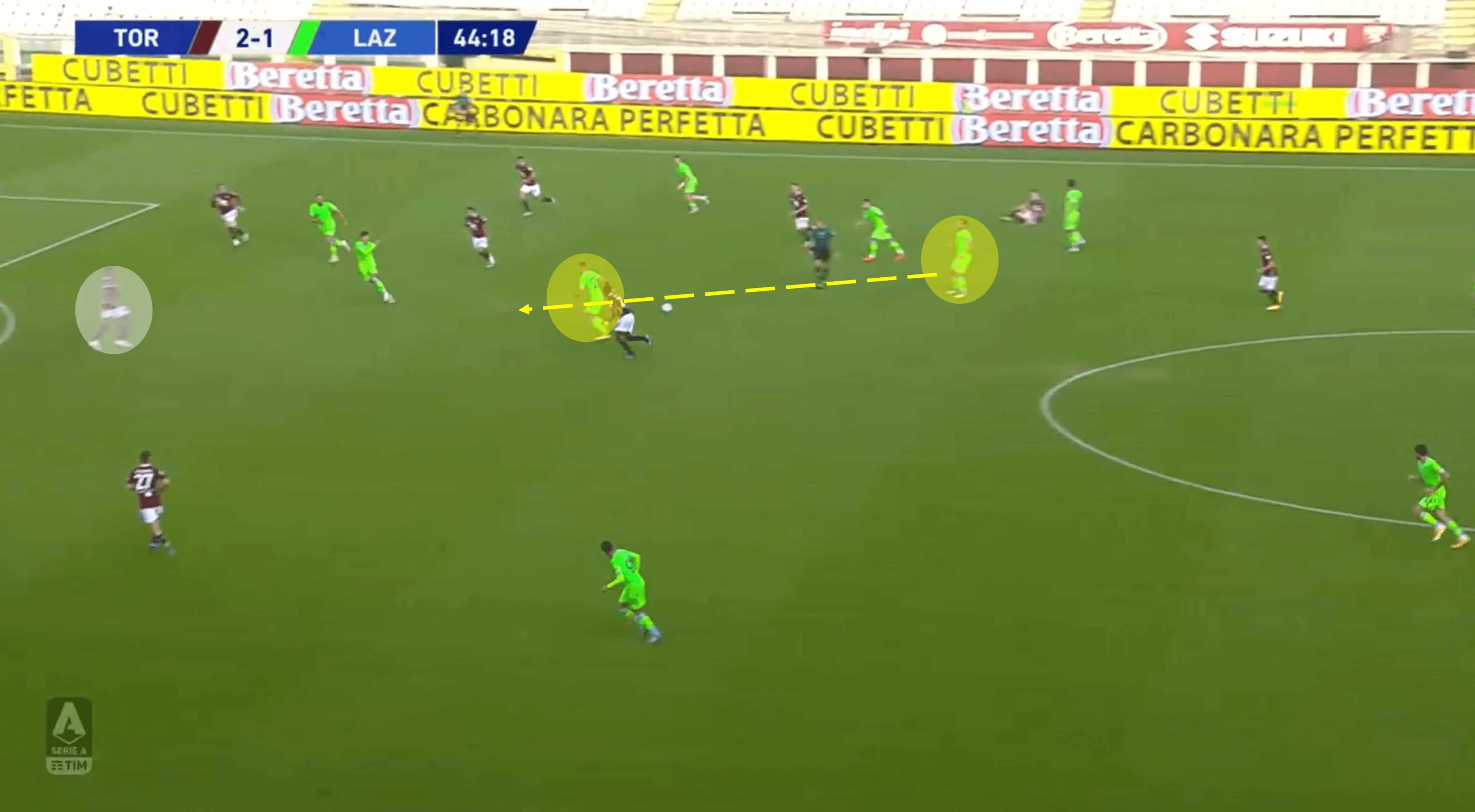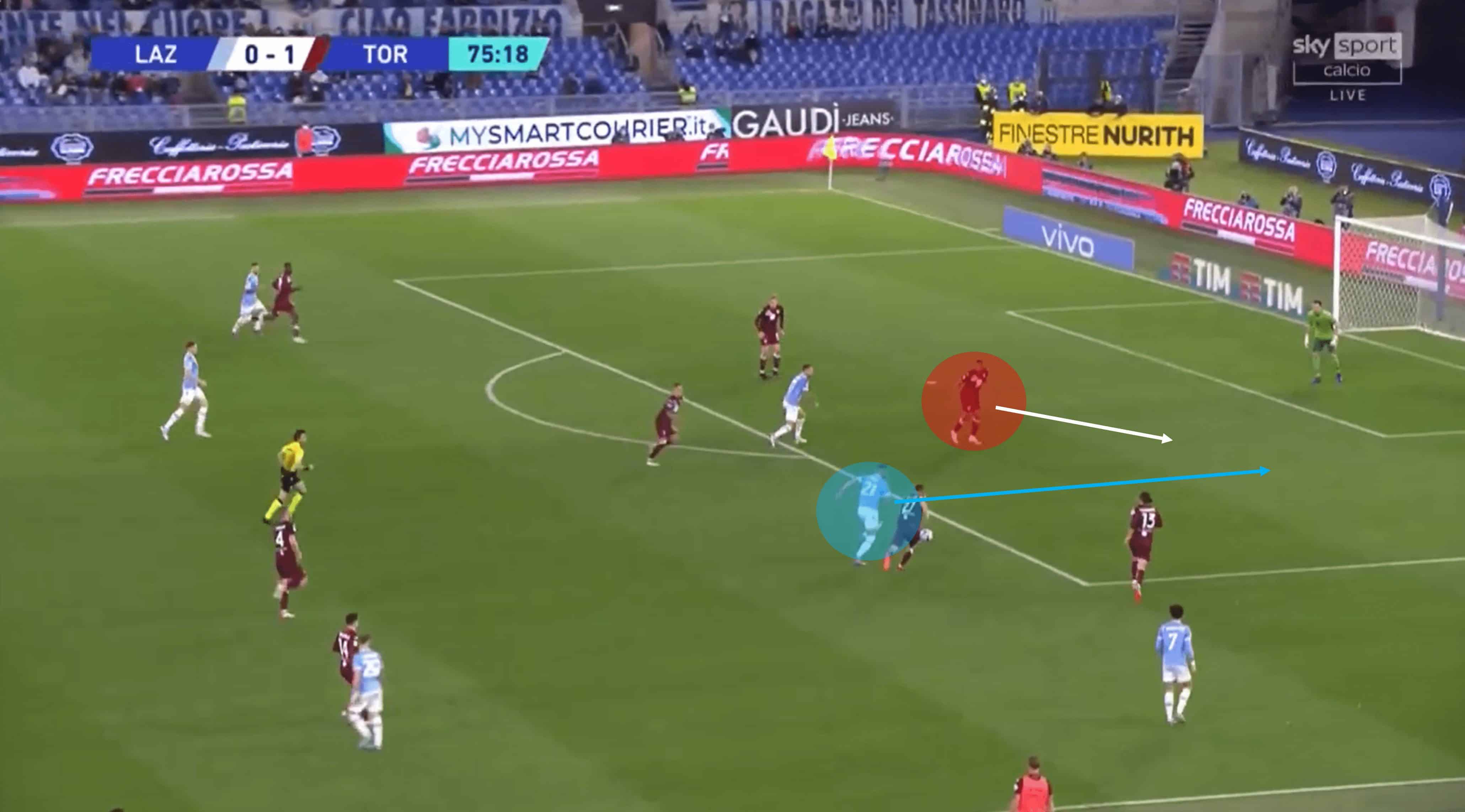 The timing was essential here from Bremer – the timing of his shift across to block the sight on goal. If he shifts across too early, then the Lazio man has an easy pass to his central teammate who will have a chance at a sitter. Similarly, if Bremer moves across too late, the Lazio man has more time to execute a shot or a cross.