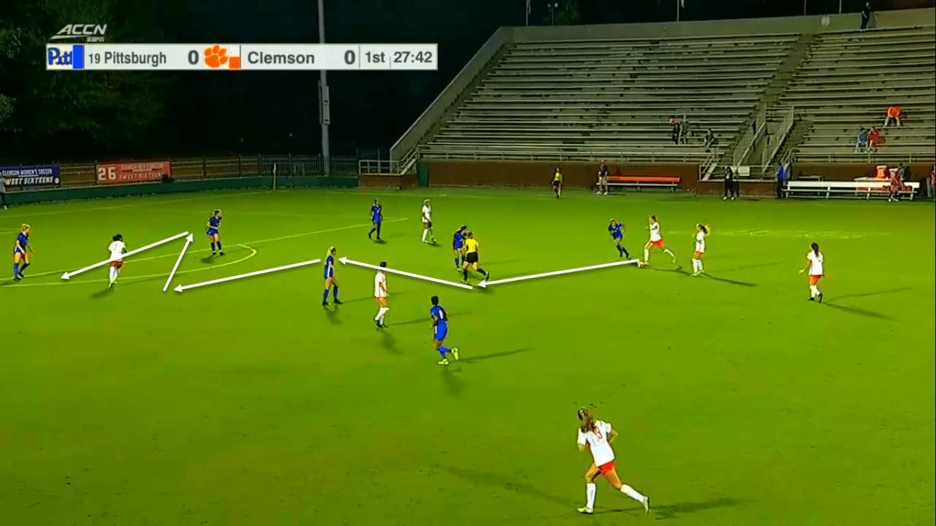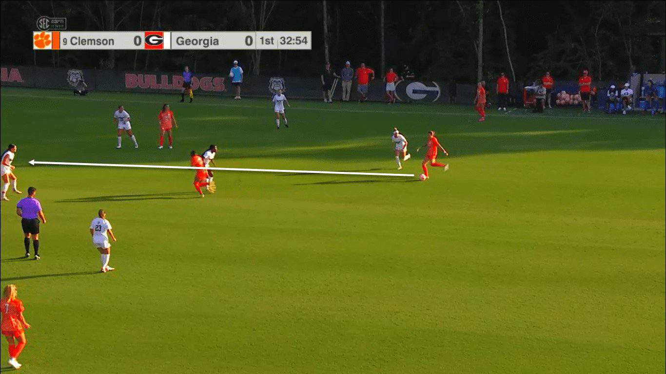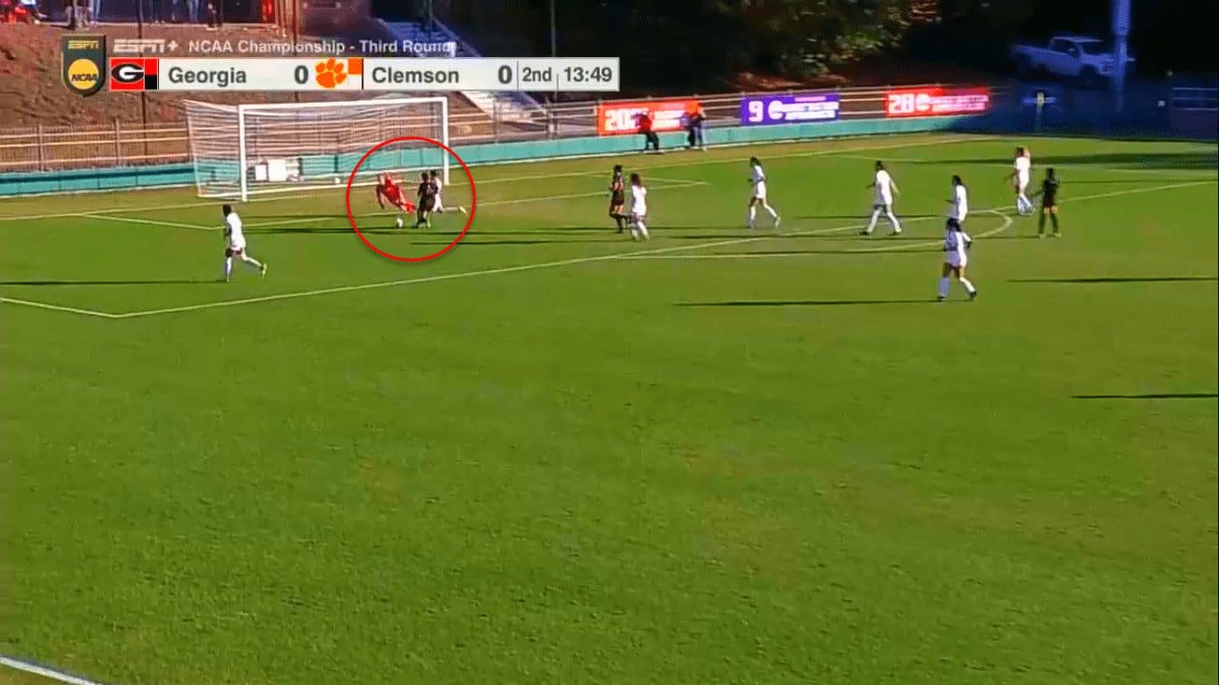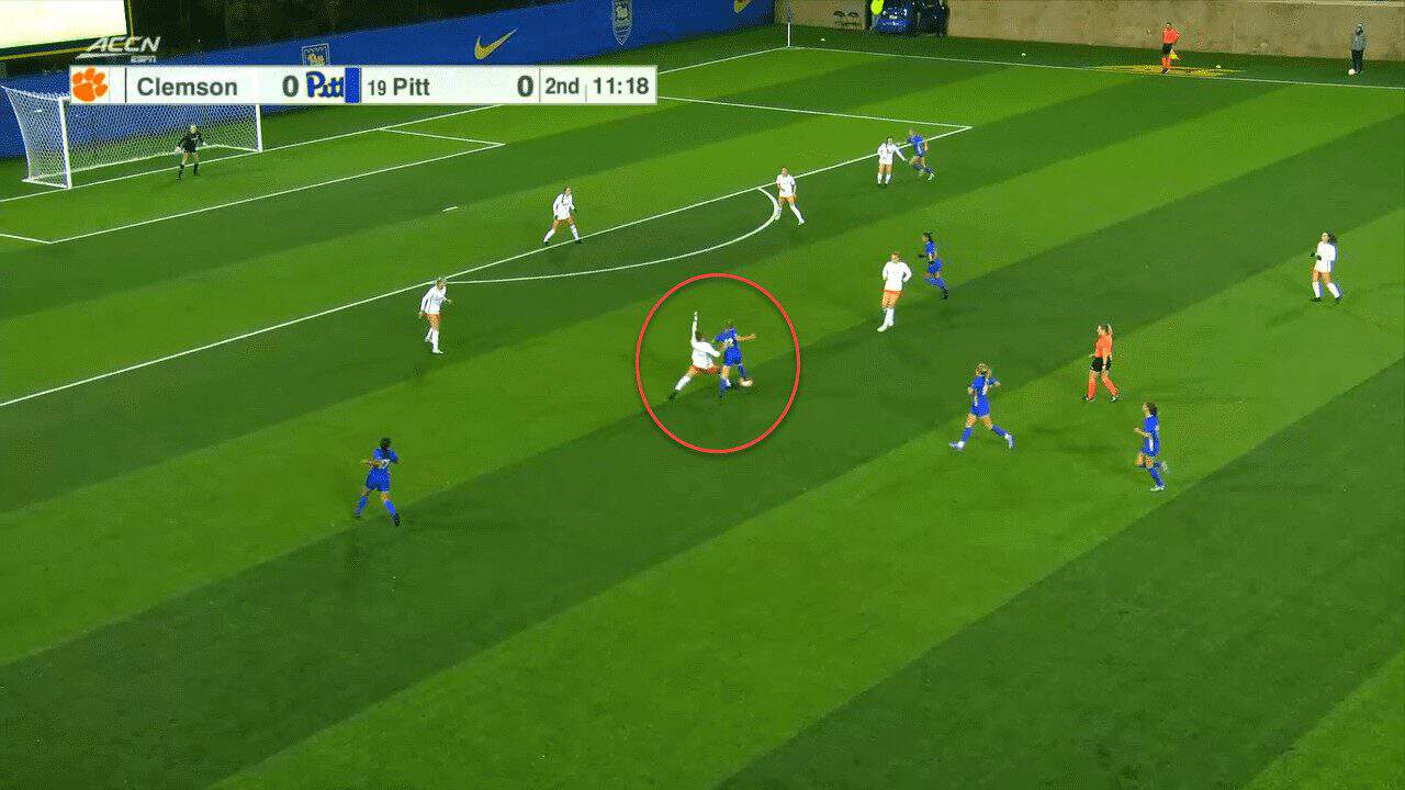 For example, the following interception of the ball was crucial to saving Clemson Tigers from conceding a goal if not for Hershfelt’s excellent effort and her ability to surpass her direct opponent and resort to a sliding clearance at a decisive moment to prevent her from shooting.
