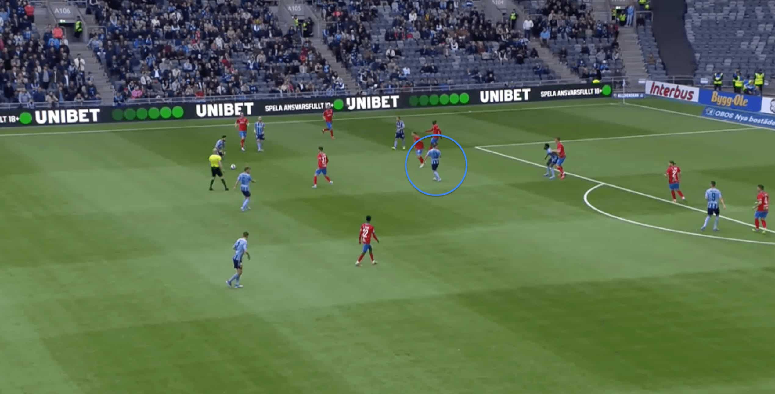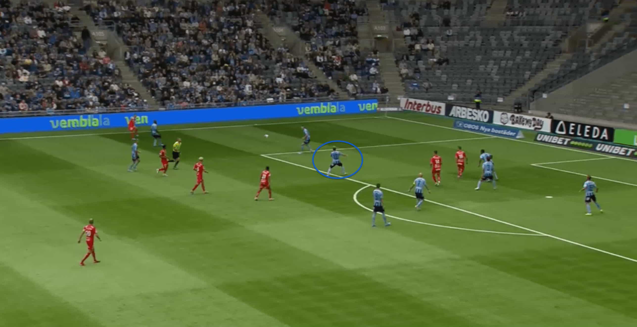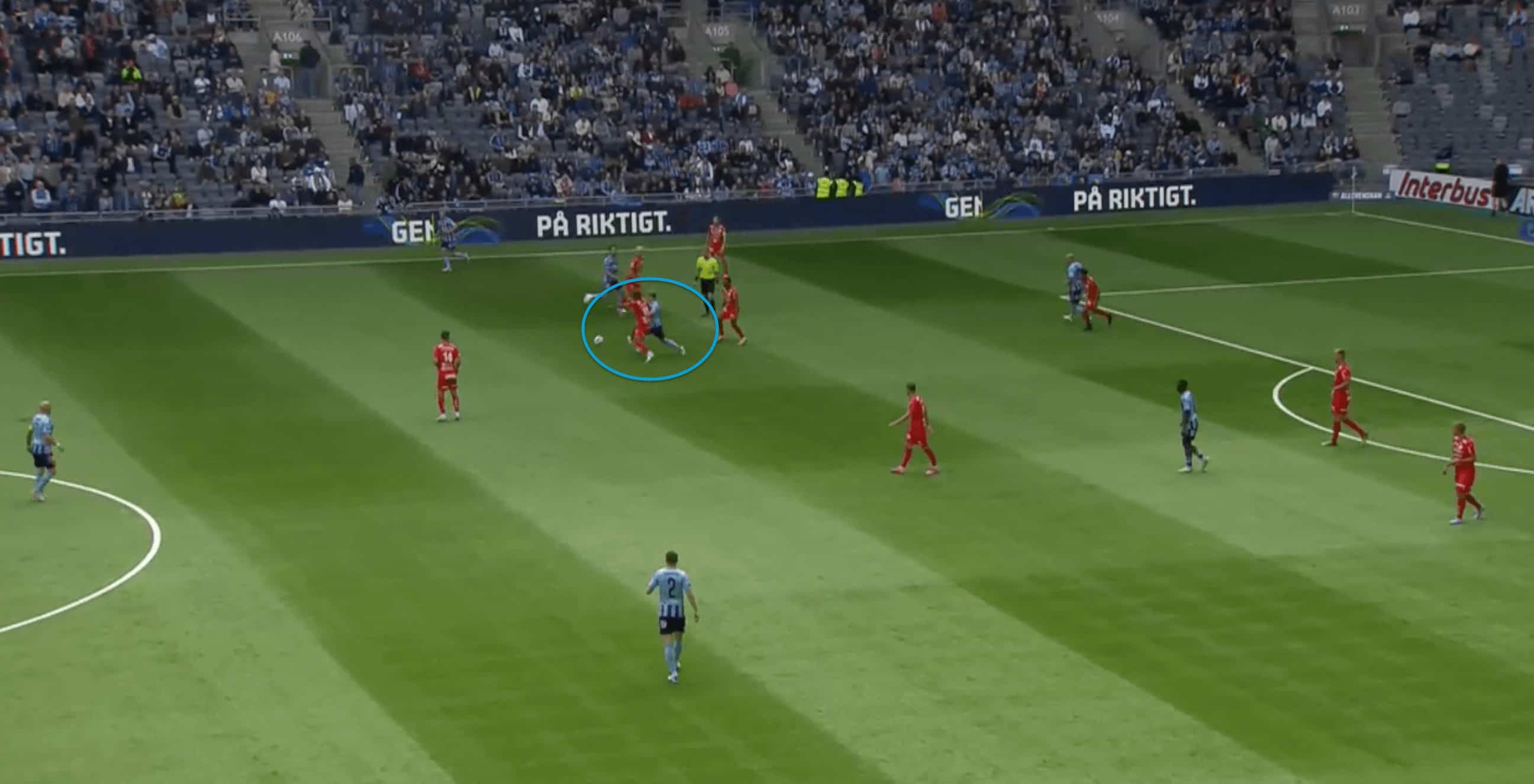 Generally, he looks to drop deep, but with most teams pressing with a lone forward, Djurgarden basically build up with two centre-backs and he acts as the pivot in front of the CBs. Mostly when the opposition looks to mark him with one of their players, he is pretty good at manipulating the opposition by constantly moving around to drag the player and create spaces or open passing lanes for his CBs to progress the ball.