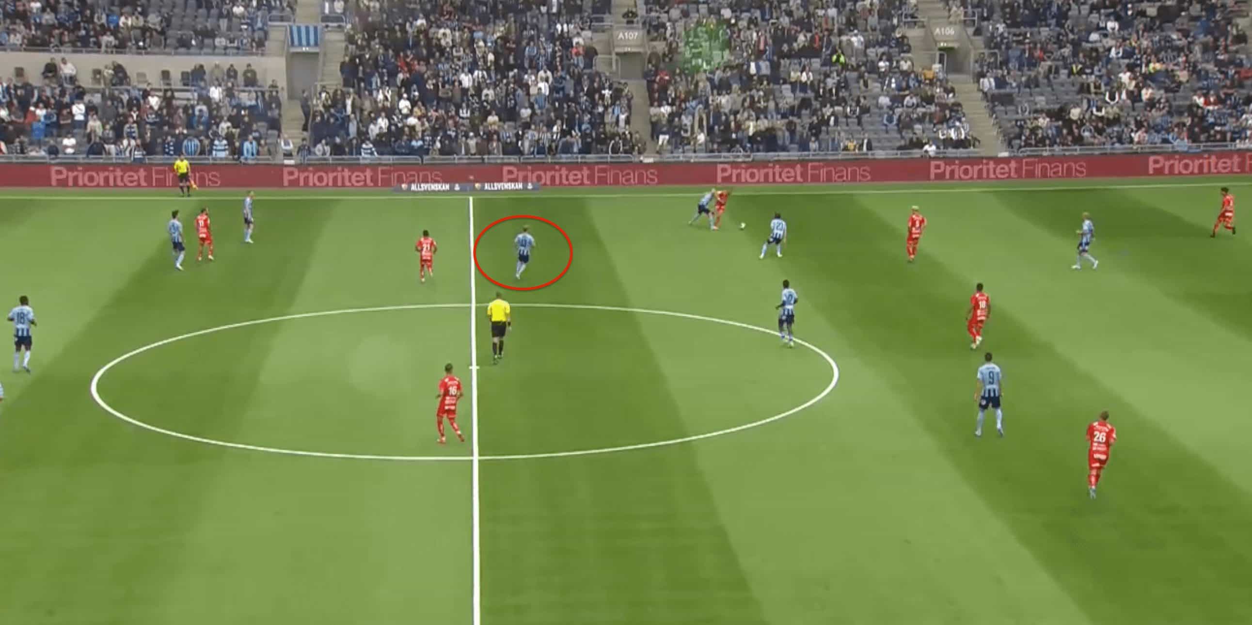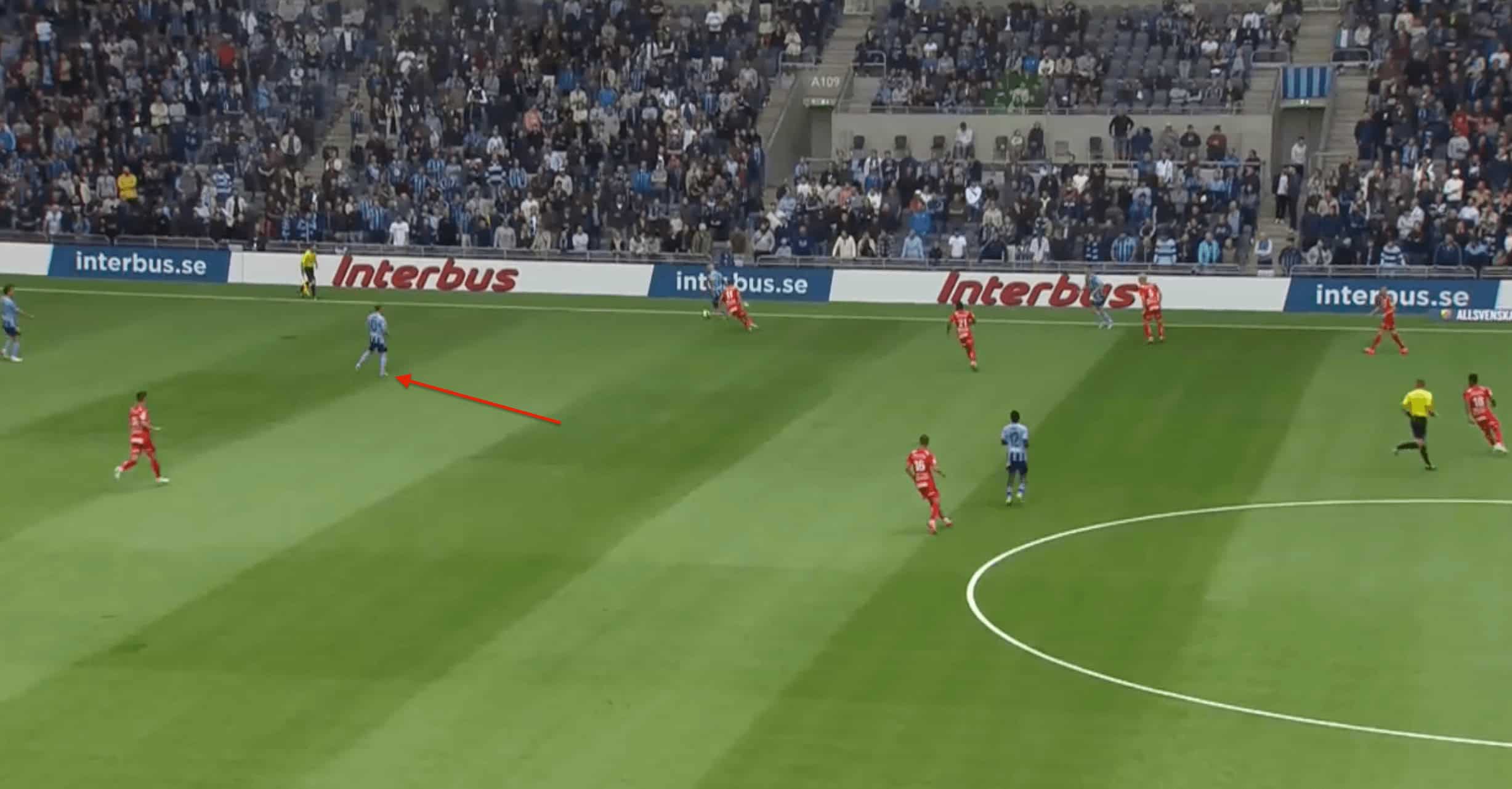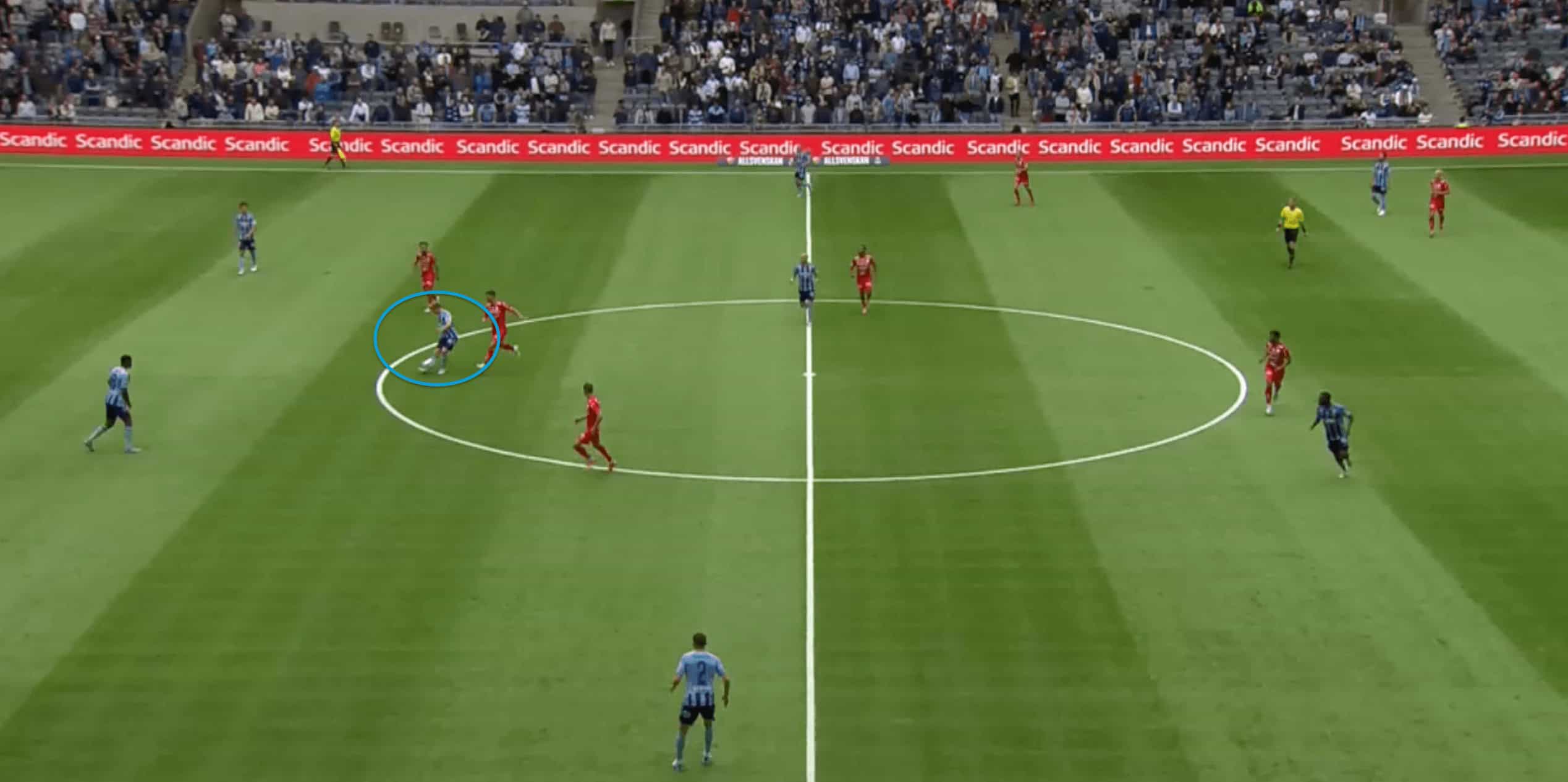 Generally, he looks to drop deep, but with most teams pressing with a lone forward, Djurgarden basically build up with two centre-backs and he acts as the pivot in front of the CBs. Mostly when the opposition looks to mark him with one of their players, he is pretty good at manipulating the opposition by constantly moving around to drag the player and create spaces or open passing lanes for his CBs to progress the ball.