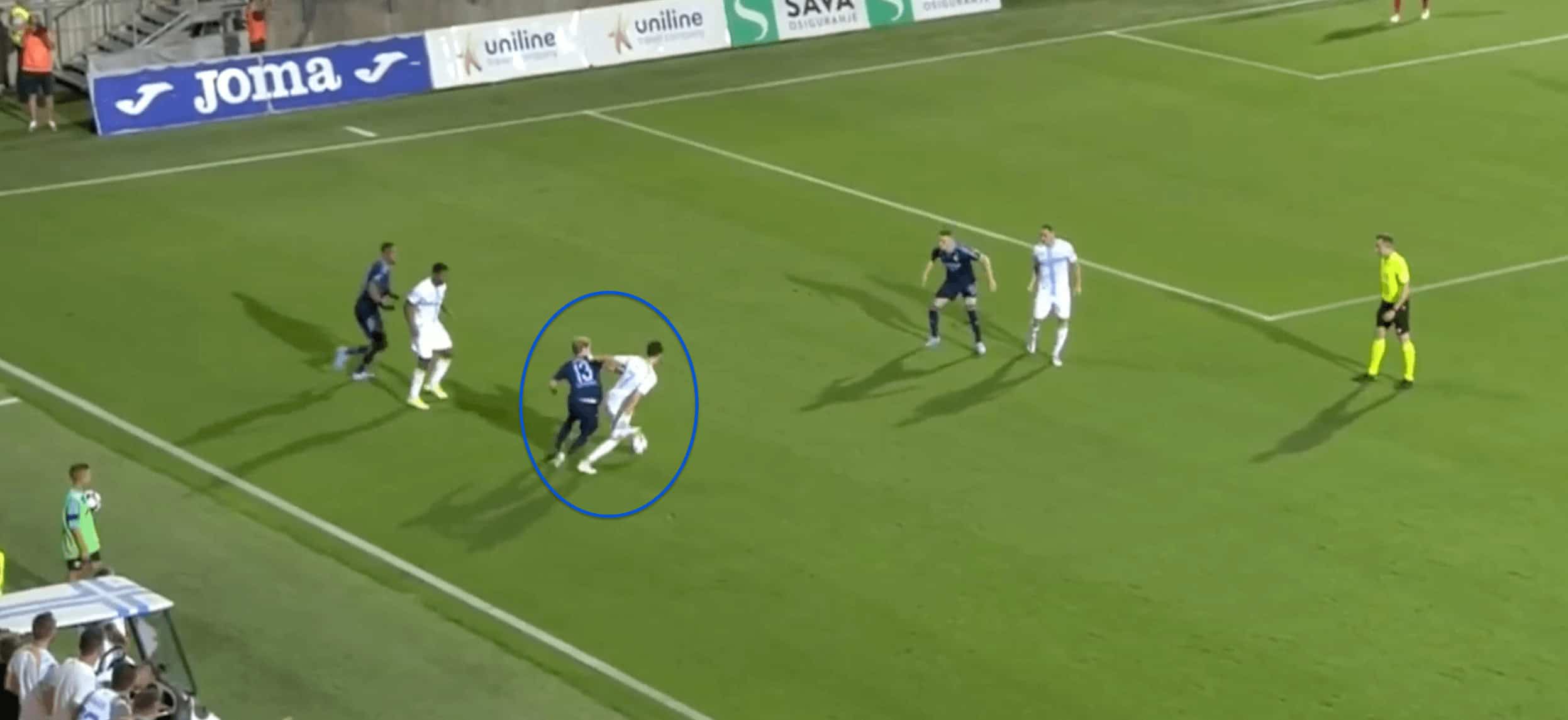 But one issue with him defensively against a settled possession would be dealing with physical challenges. Physically, he is not as strong as you would expect a defensive midfielder would be and he is someone who can be easily bullied by stronger players on the pitch. In the example below we can see him losing the ball to an opposition player when he pressures him and behind and he easily nudges him to dispossess and take the ball away from him.