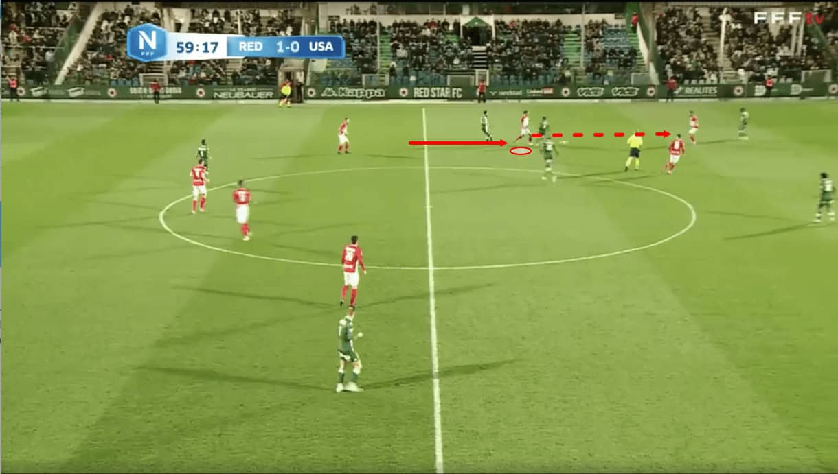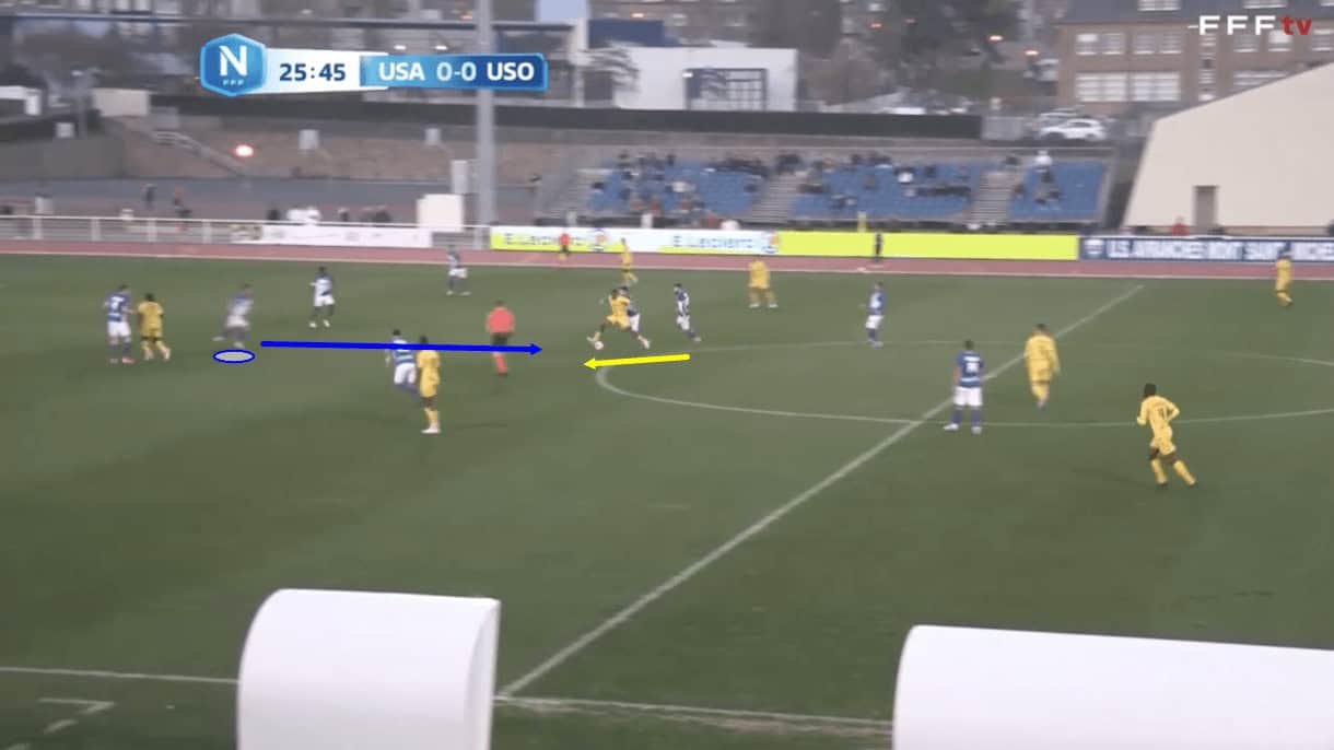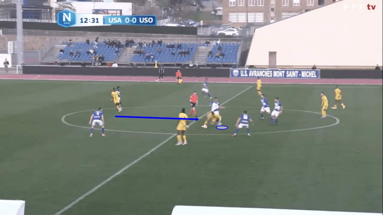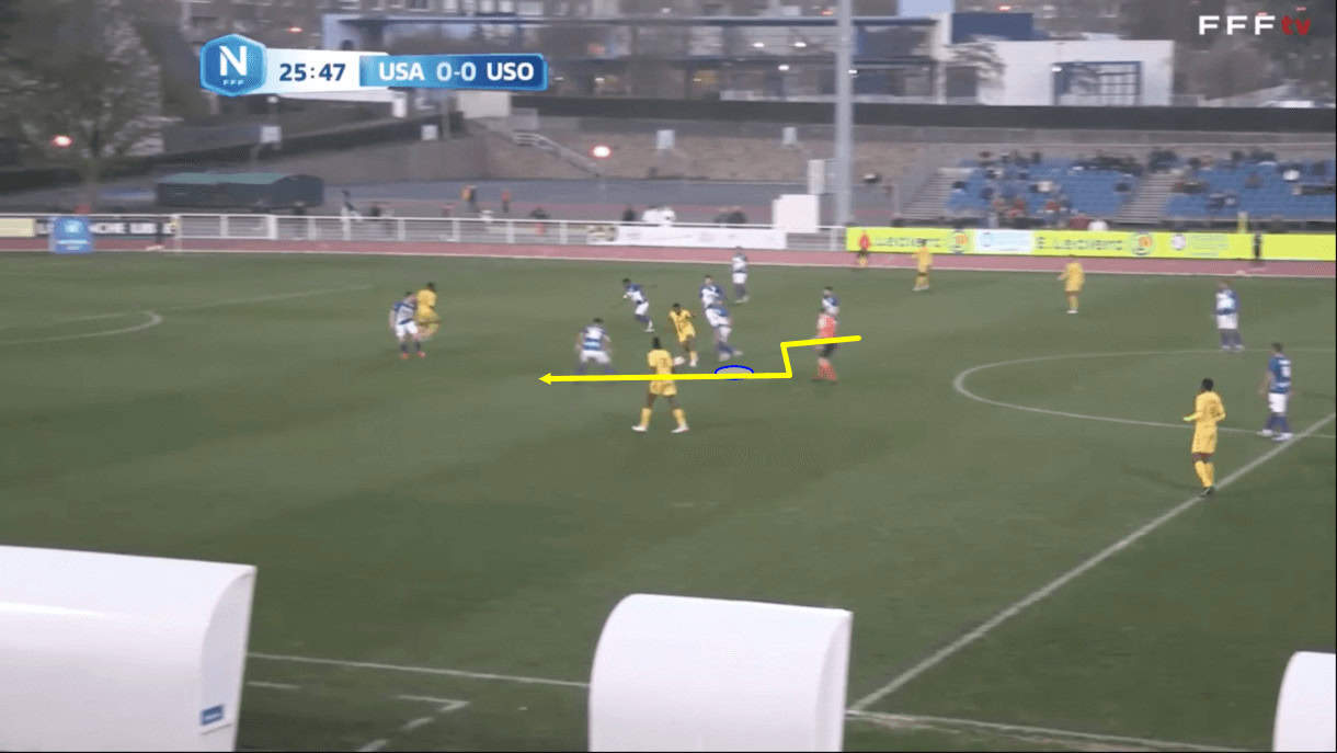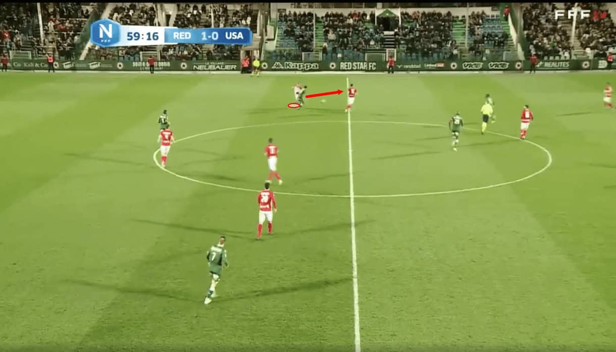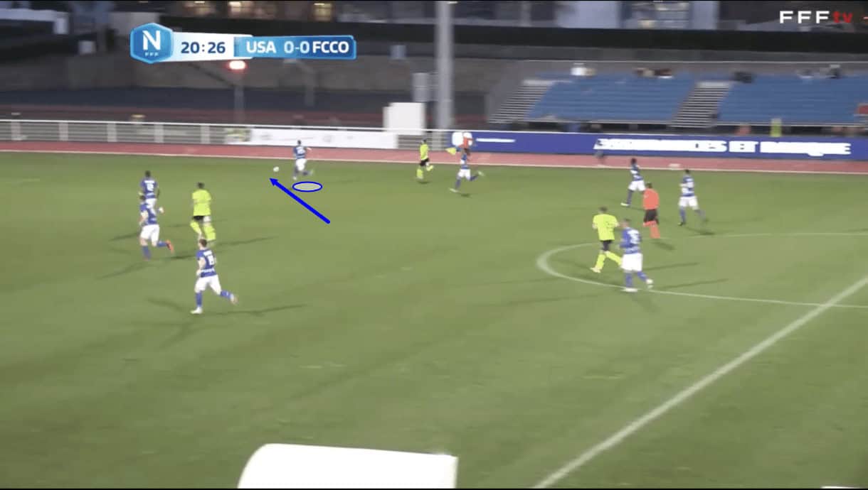 As well as technique and vision, which we analysed extensively in the previous section of analysis, ball control, a good first touch and both technical and mental ability under pressure are important aspects of the Avranches man’s game worth noting. This next section of our scout report looks deeper into these particular aspects of the 25-year-old’s game, beginning with some analysis of an in-game example of the centre-back playing out of pressure in a more advanced area of the pitch in figures 5-6.
