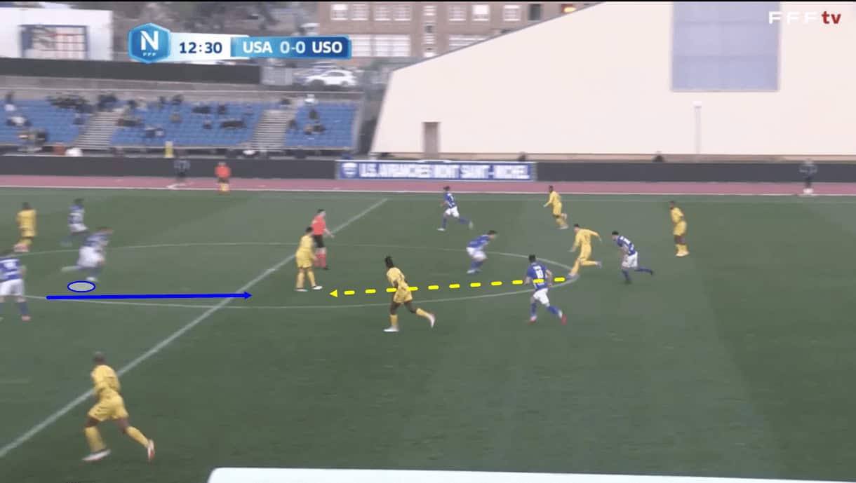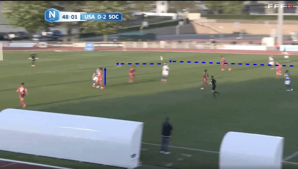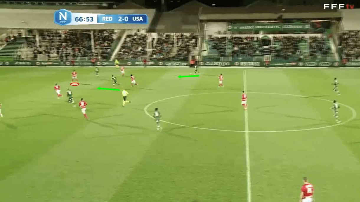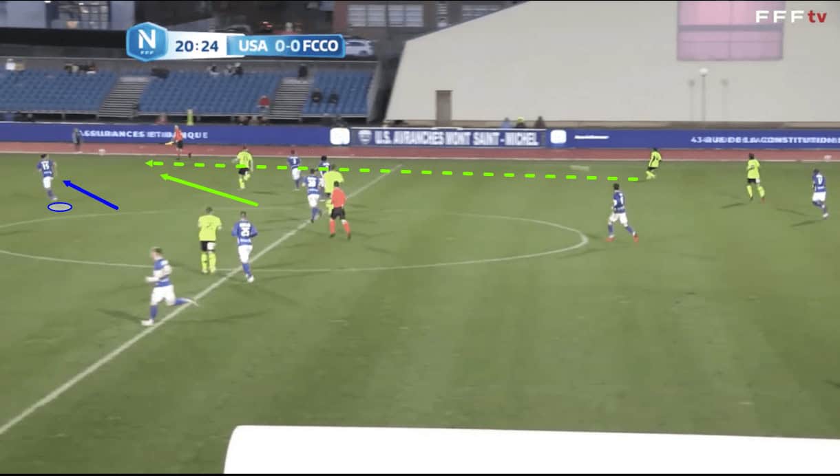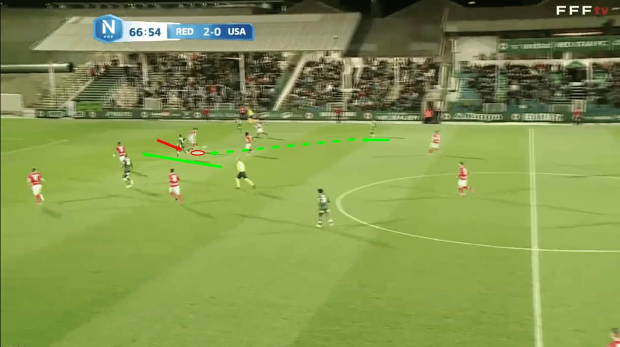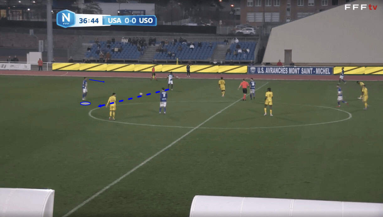 As well as technique and vision, which we analysed extensively in the previous section of analysis, ball control, a good first touch and both technical and mental ability under pressure are important aspects of the Avranches man’s game worth noting. This next section of our scout report looks deeper into these particular aspects of the 25-year-old’s game, beginning with some analysis of an in-game example of the centre-back playing out of pressure in a more advanced area of the pitch in figures 5-6.