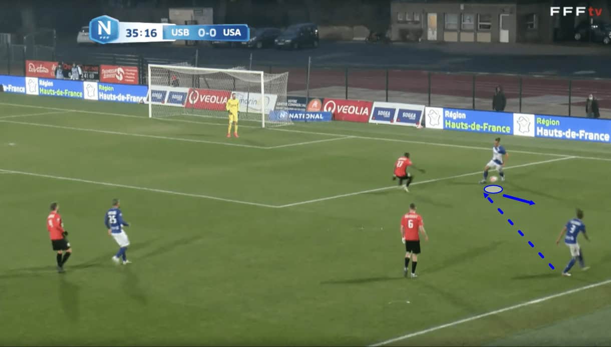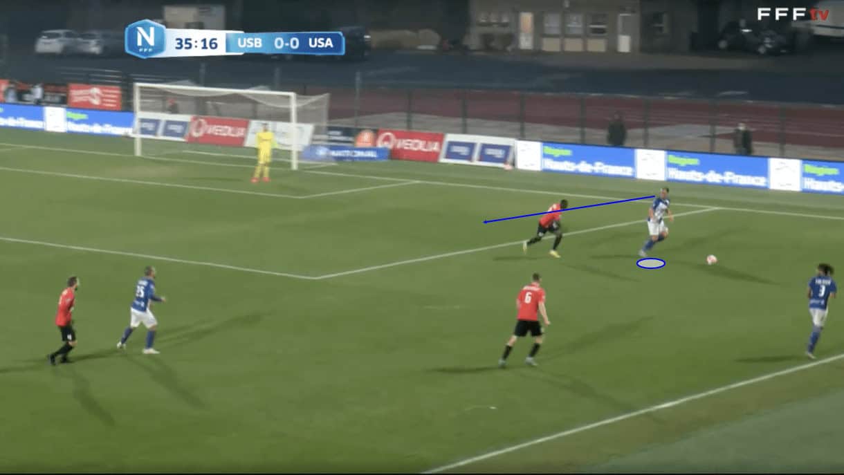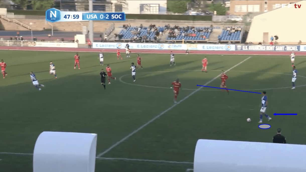 Defensively, Voyer needs more protection than he’s been offered at Avranches this term if you’re going to get the best out of him. In particular, I’d like to see the defender focus less on improving his game as an aggressive defender and focus more on nailing his role as a more passive defender. I’d be interested in seeing Voyer used as a central centre-back in a three-centre-back defence, given licence to not worry too much about defending the space in front of him and allowed to focus on sweeping up behind and defending this space. I think the protection of two central defensive partners on either side along with more midfield protection than he’s had this season would alleviate the pressure on Voyer’s defensive game while highlighting where he excels off the ball, while still availing of his obvious on-the-ball qualities.