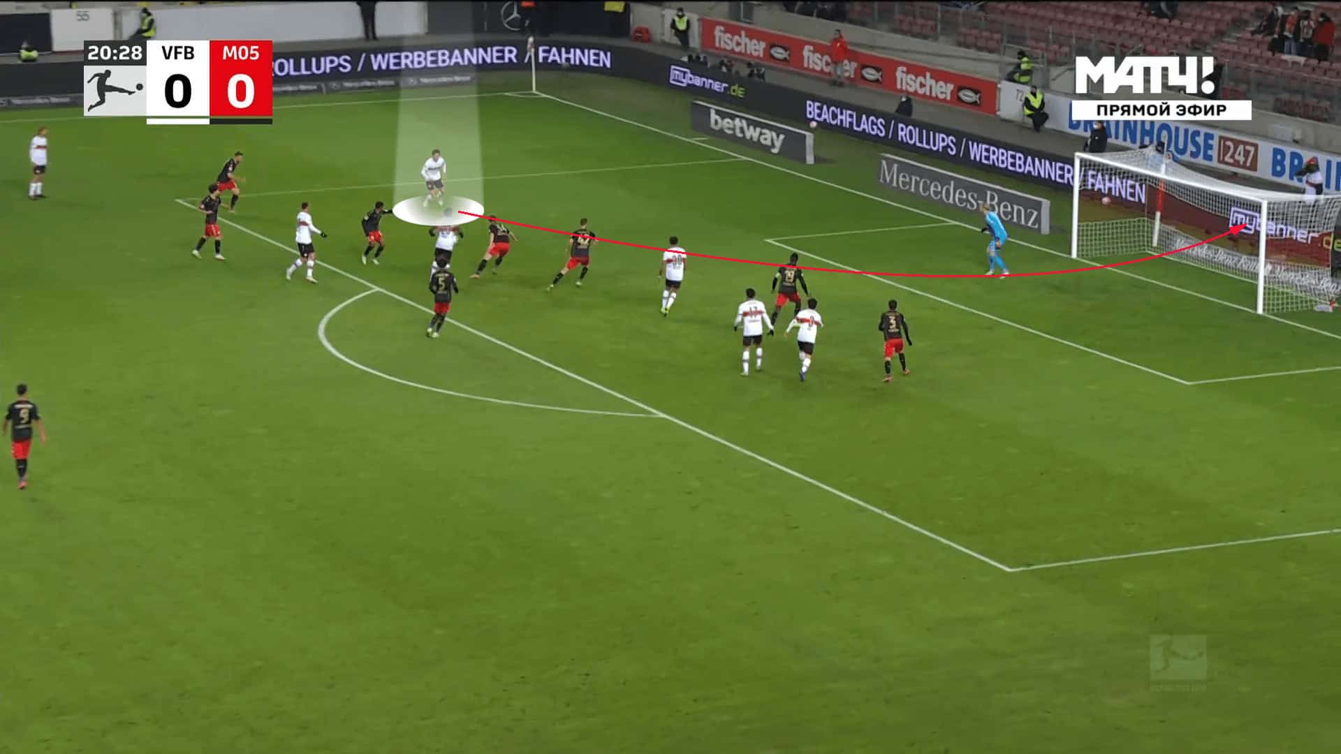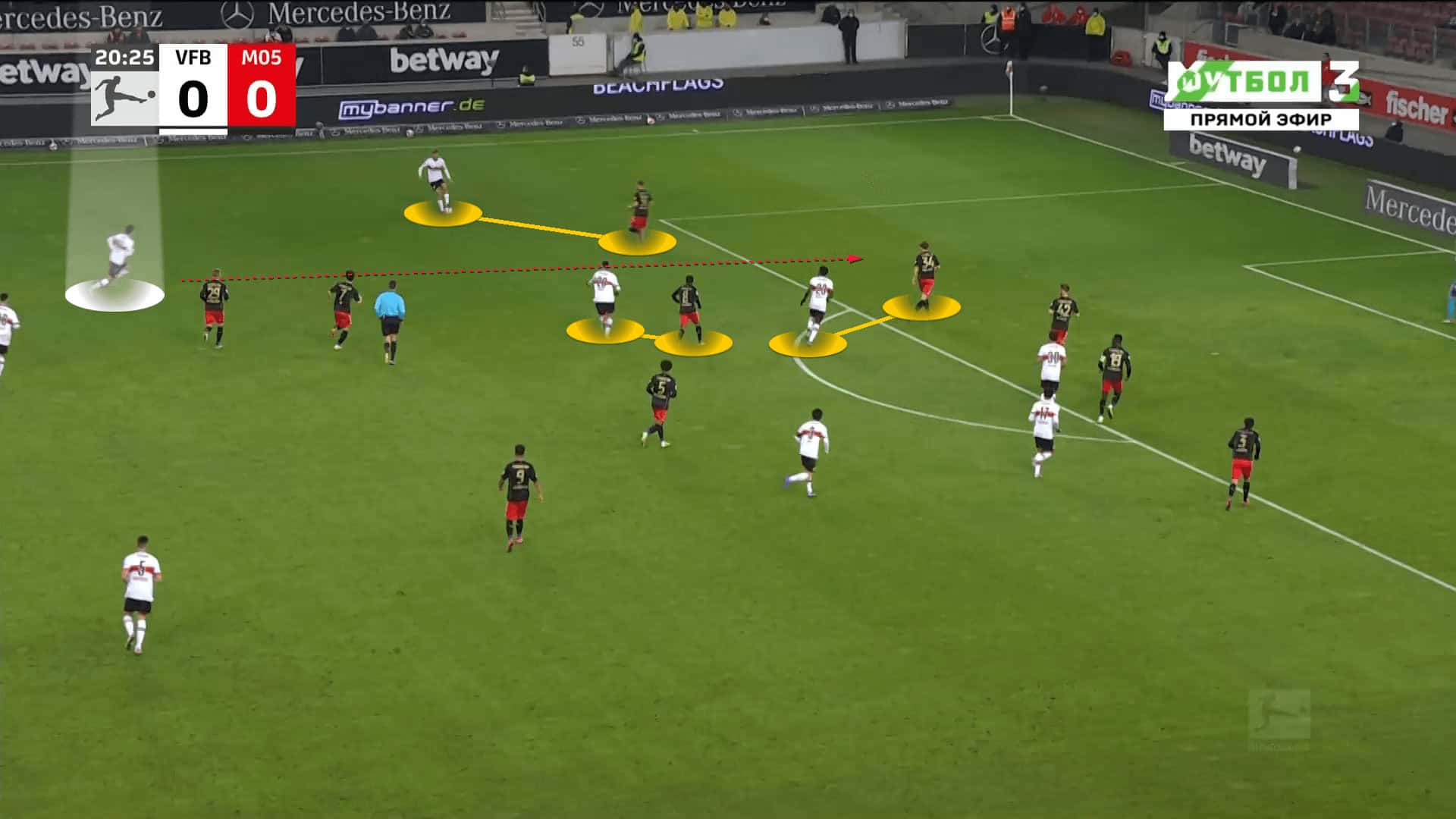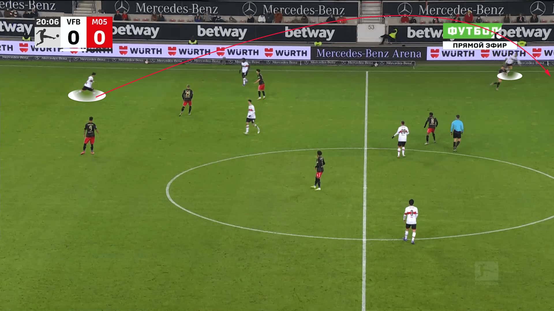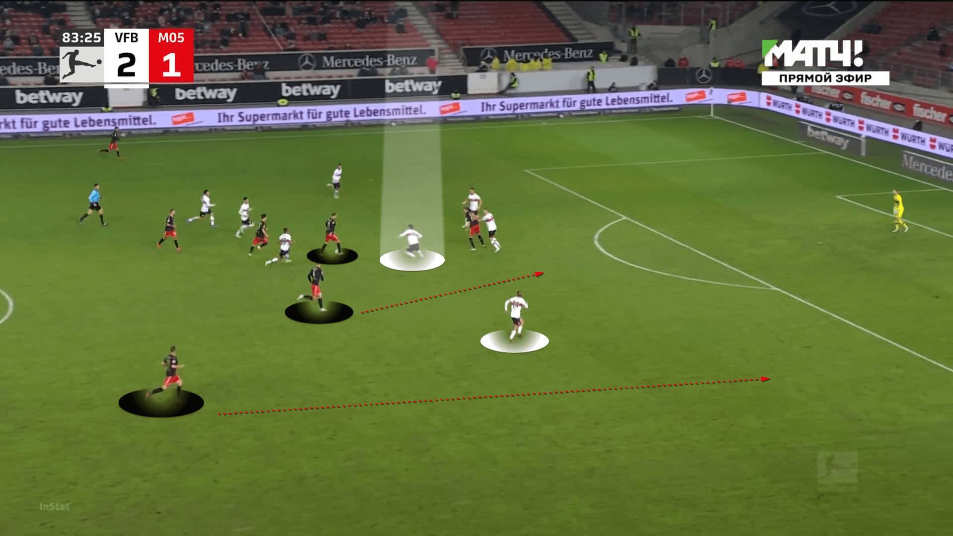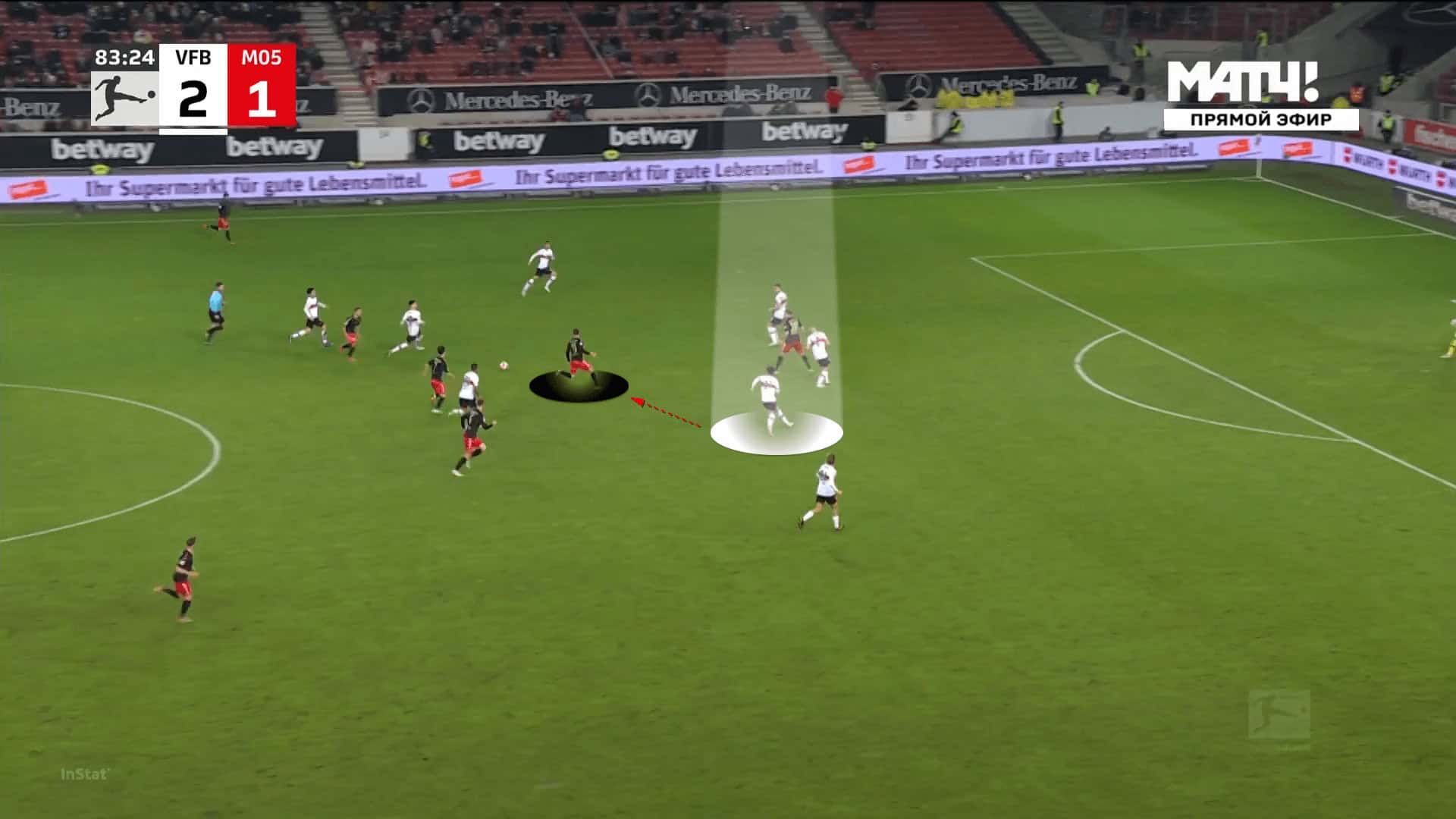 Now that the ball is in into the final third, Stuttgart looks to find an opening. The ball eventually finds itself back on the left-hand side. Space within the Mainz 05 back-line is created because of defenders being occupied by Stuttgart attackers. Ito recognises this space and makes a darting run into it.
