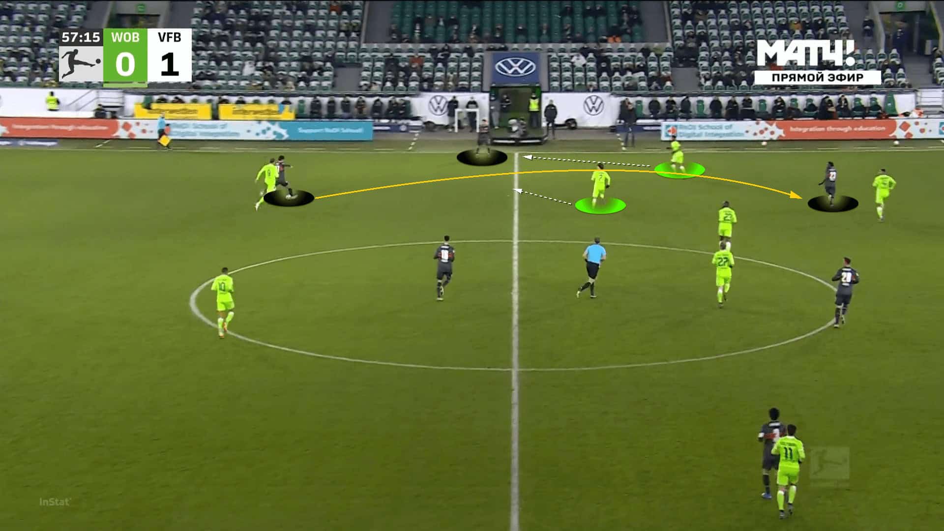His passing pedigree does not stop there, as Ito has shown to have a good disguise when passing, to catch opposition markers off guard. Here, Ito receives the ball from his centre-back counterpart, and once in full control of the ball, the Stuttgart defender drives into the left half-space.