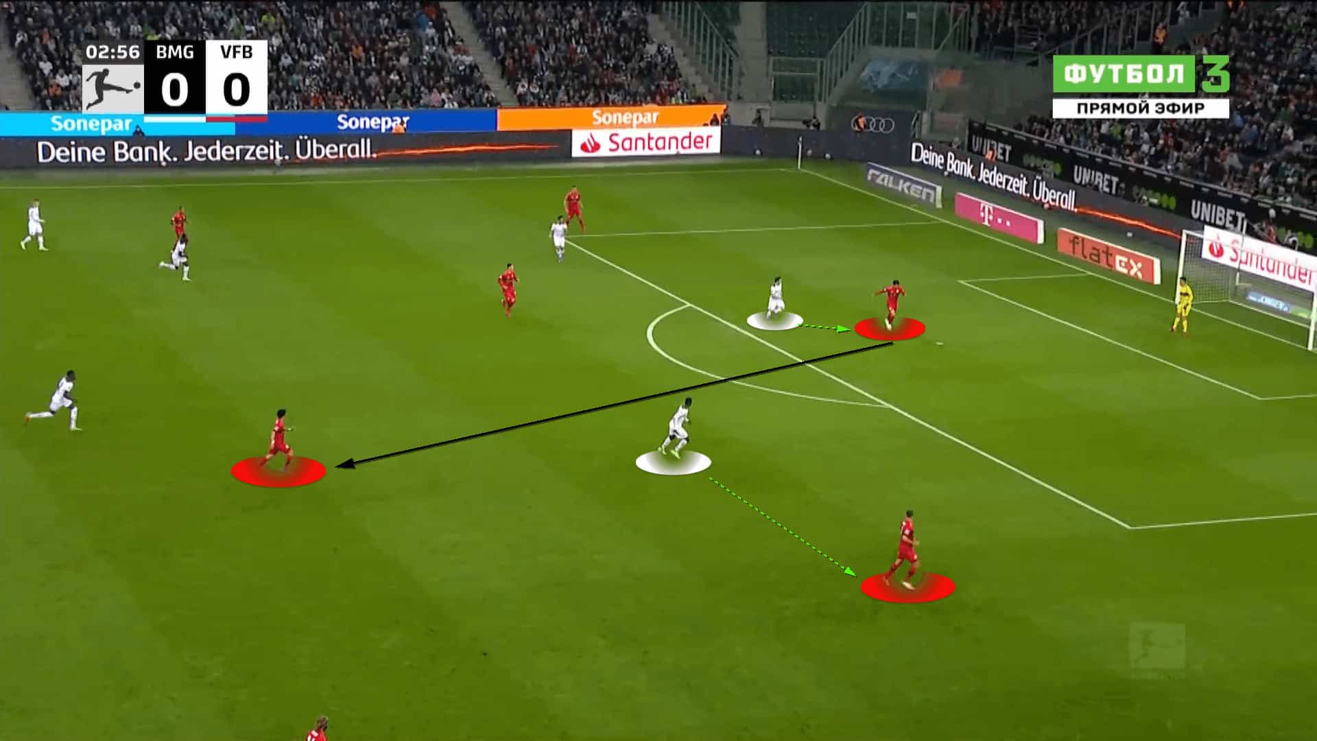 During this scenario, Ito is under pressure from a Gladbach attacker. While under this strain, Ito does well to manipulate his body position; acting as if he was going to pass outside when his true intention is to pass centrally. This situation is a perfect example of Hiroki Ito’s technical skill; as he is a player that can play out of pressure, operate with one to three touches to perform an action, besides his forward-thinking and ability to wrap his passes around opposition markers.