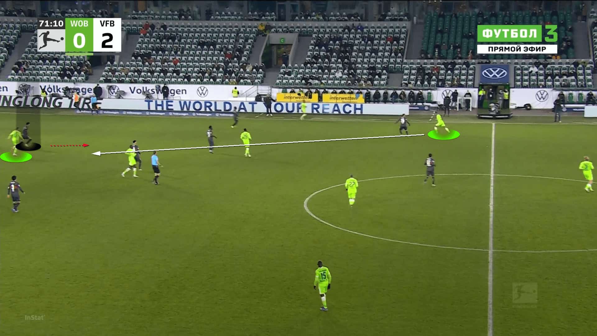 Here, a Wolfsburg player is in possession, attempting to send a vertical driven ball to an attacker. Before this pass, if fired, Ito smartly checks behind his right shoulder, in order to interpret the danger that is around him. Just before the ball is driven forward, Ito makes the first step before the attacker, anticipating the pass and clearing the danger.