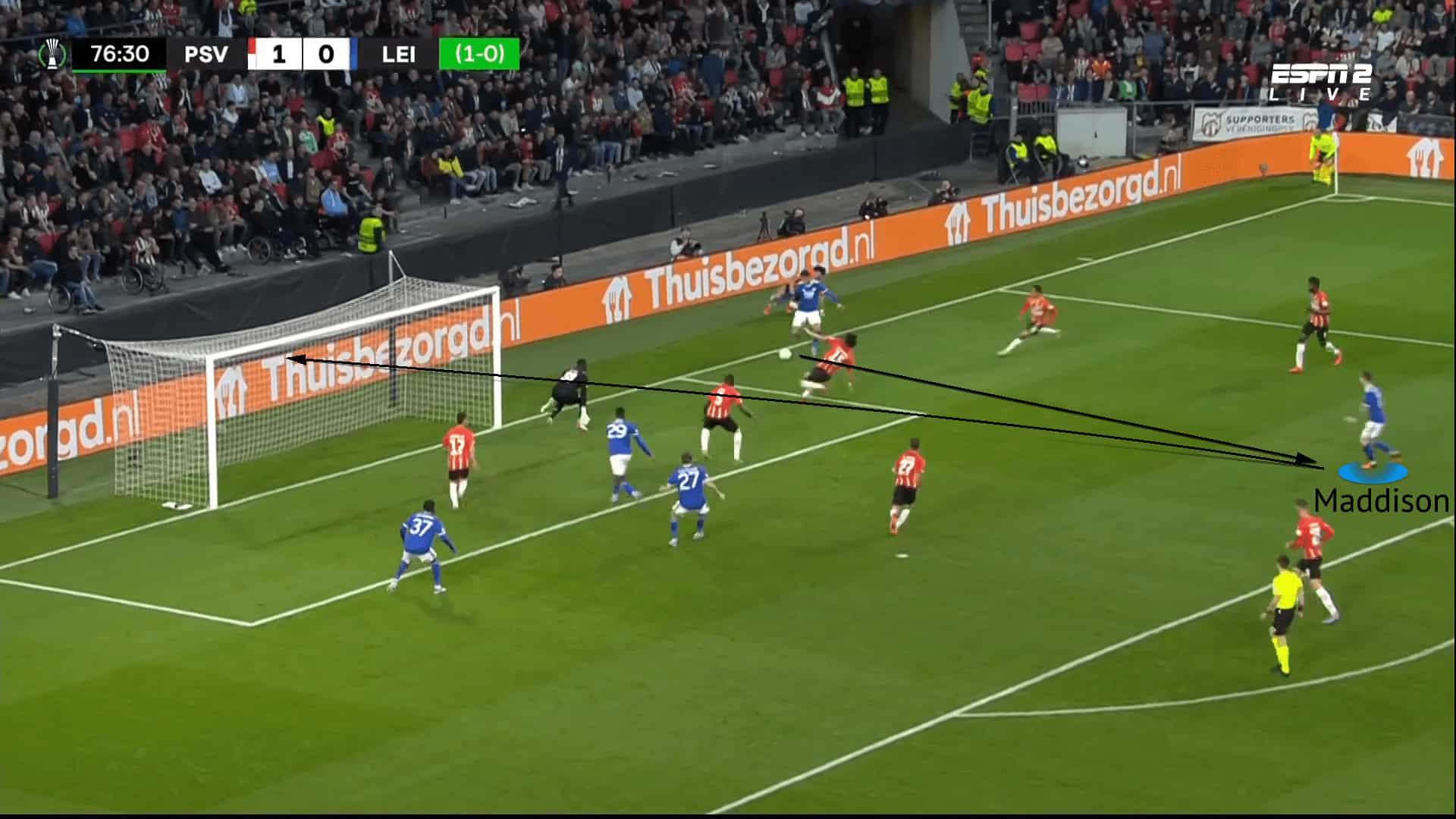 The image above shows Maddison arriving into the box to score a crucial goal at PSV Eindhoven in the UEFA Europa Conference League last season. Initially looking to provide a passing option for right-back Ricardo Pereira, Maddison enters the box after some exceptional work from Ayoze Pérez. The Spaniard pulls the ball back to Maddison, whose sidefoot finish incredibly avoids Mario Götze’s slide tackle and manages to find the only gap between defender Jordan Teze and goalkeeper Yvon Mvogo.