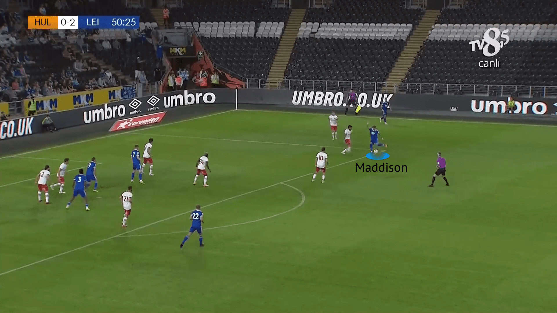An example of this is his goal at Tottenham Hotspur. Right-back Timothy Castagne has come out on top in the aerial duel with Spurs defender Ryan Sessegnon from Kiernan Dewsbury-Hall’s switch of play. Managing to create a yard of space, the Belgian bounces a cross into Maddison, the only Leicester player in the box. Maddison is able to connect well with the testing delivery as his half-volley loops beyond goalkeeper Hugo Lloris into the side netting.