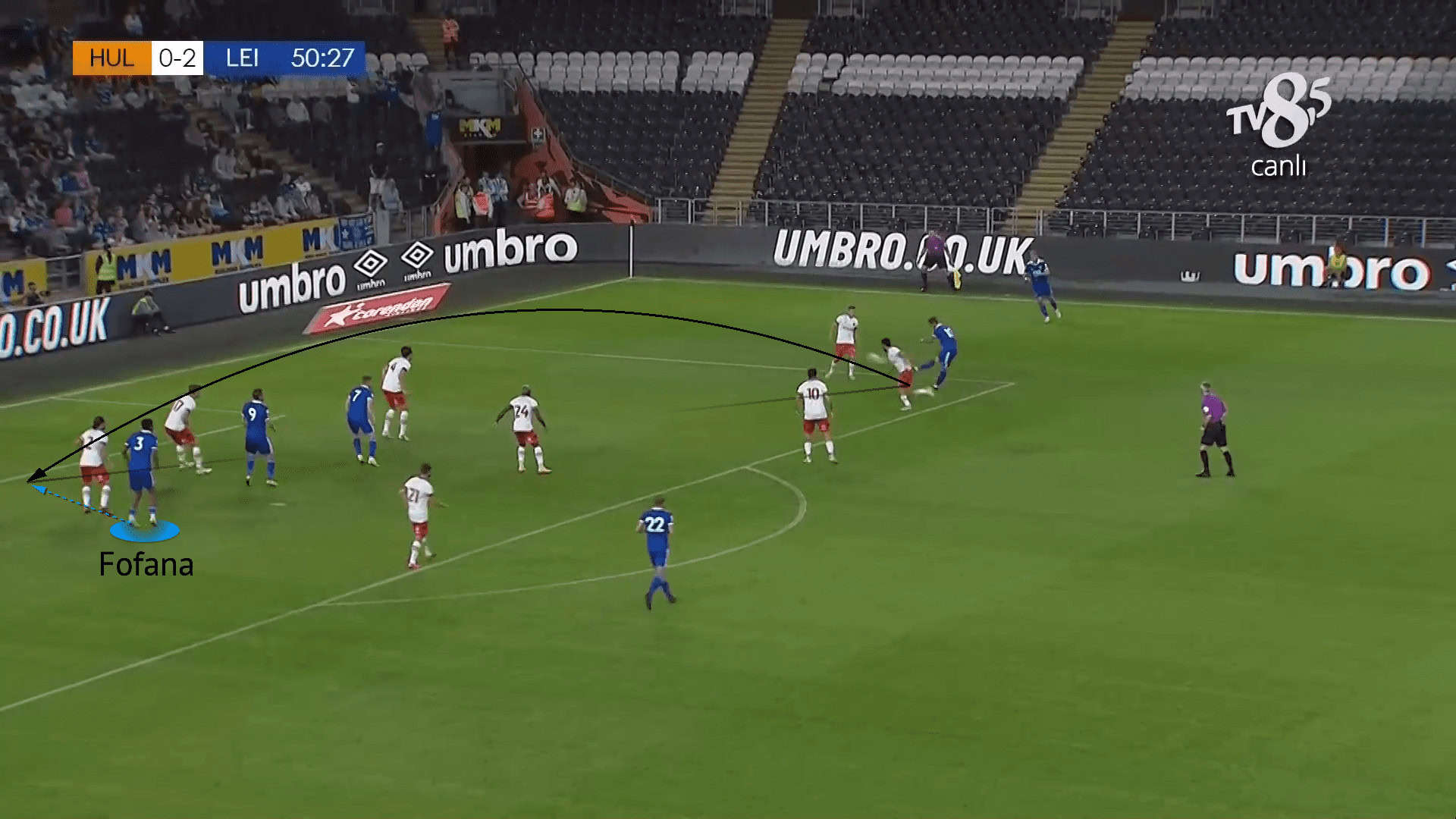 In these two images, the Englishman is free to drift in the final third to the right half-space and overload the opposition’s full-back. Upon reception, Maddison draws out the nearest opponent and shifts the ball to fake a left-foot shot from the edge of the box. The defender overcommits, lunging to block the potential shot, allowing Maddison to cut back onto his stronger right foot and dig out a cross for Wesley Fofana to convert.