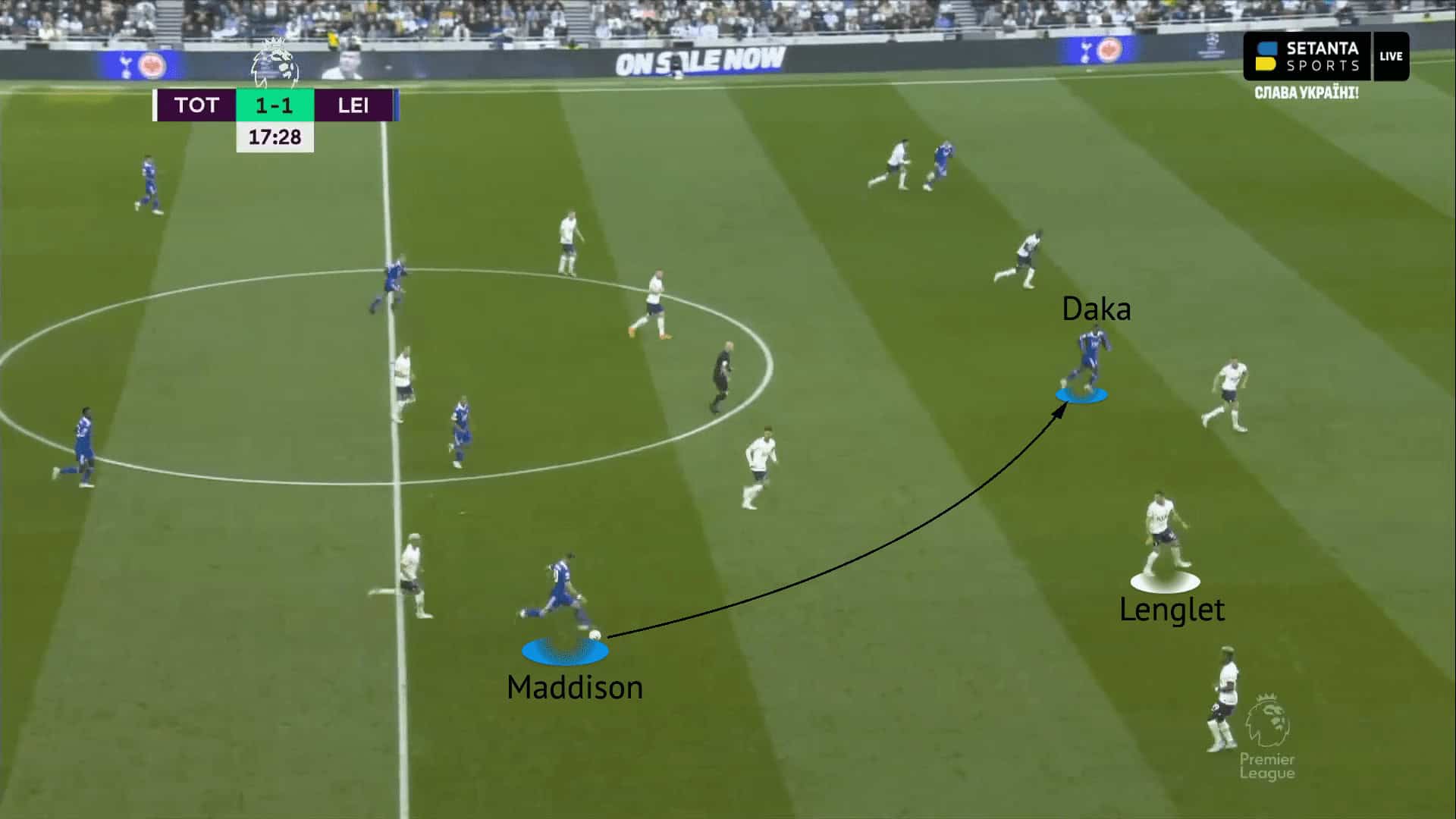 The image above is an example of Maddison drifting to the right half-space from his right midfield role. The Englishman has dropped away from Tottenham’s defensive line, creating a dilemma for new signing Clément Lenglet and wing-back Ryan Sessegnon. The defenders decide to remain in the backline, rather than following Maddison, allowing him to receive behind Richarlison and away from Rodrigo Bentancur. As a result, Maddison can turn and shift the ball out of his feet before firing a pass into striker Patson Daka.