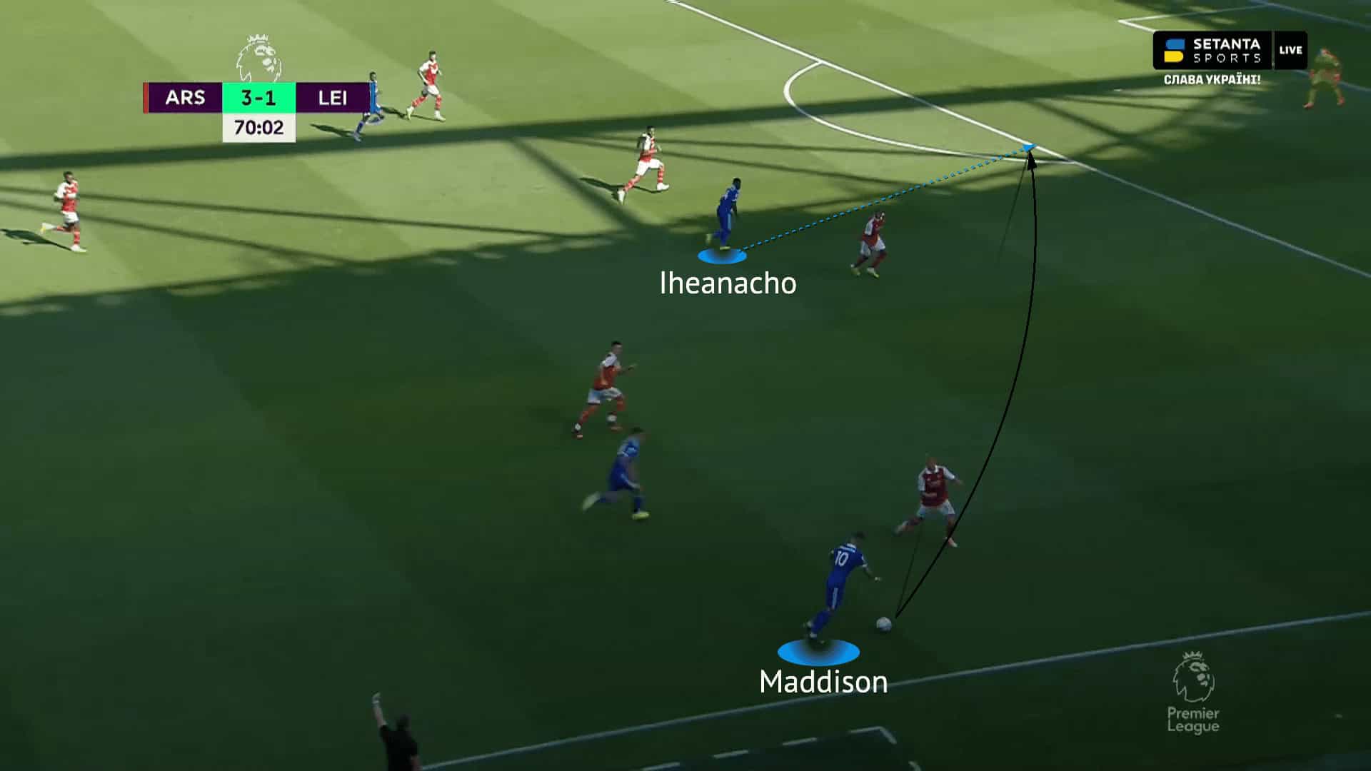 In the image above, Maddison is willing to receive off defender Daniel Amartey in the centre of an Arsenal diamond. With Ødegaard closing over Maddison’s left shoulder, the Englishman scans and takes a first touch into the Arsenal half to evade Ødegaard. As holding midfielder Thomas Partey begins to shift across, Maddison plays an outside of the foot trivela pass behind Ben White for marauding full-back James Justin to receive. Maddison frequently attempts this type of pass, avoiding usage of his left foot.