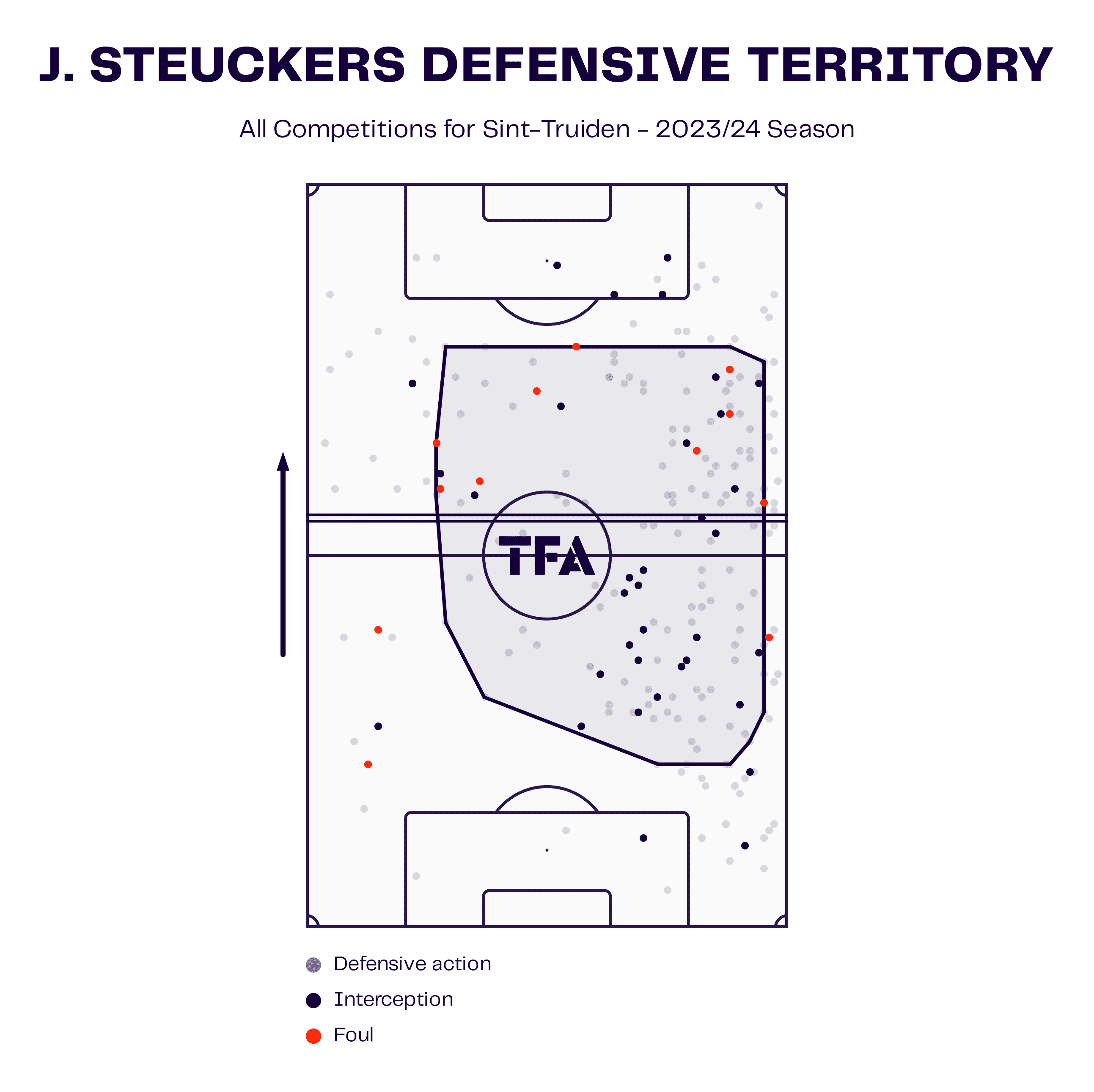 The graphic above shows the defensive territory of Steuckers this season for Sint-Truiden, and we can see the low impact he tends to have on the defensive side of proceedings. From a statistical perspective, the 22-year-old only averaged 3.13 defensive duels per 90 minutes in the 2023/24 season, with just over a 50% success rate. He also struggles aerially, with only 0.84 aerial duels per 90 minutes last season and a 34.5% success rate. Some of this might be down to his height (5’10”), but this is definitely an area of improvement.