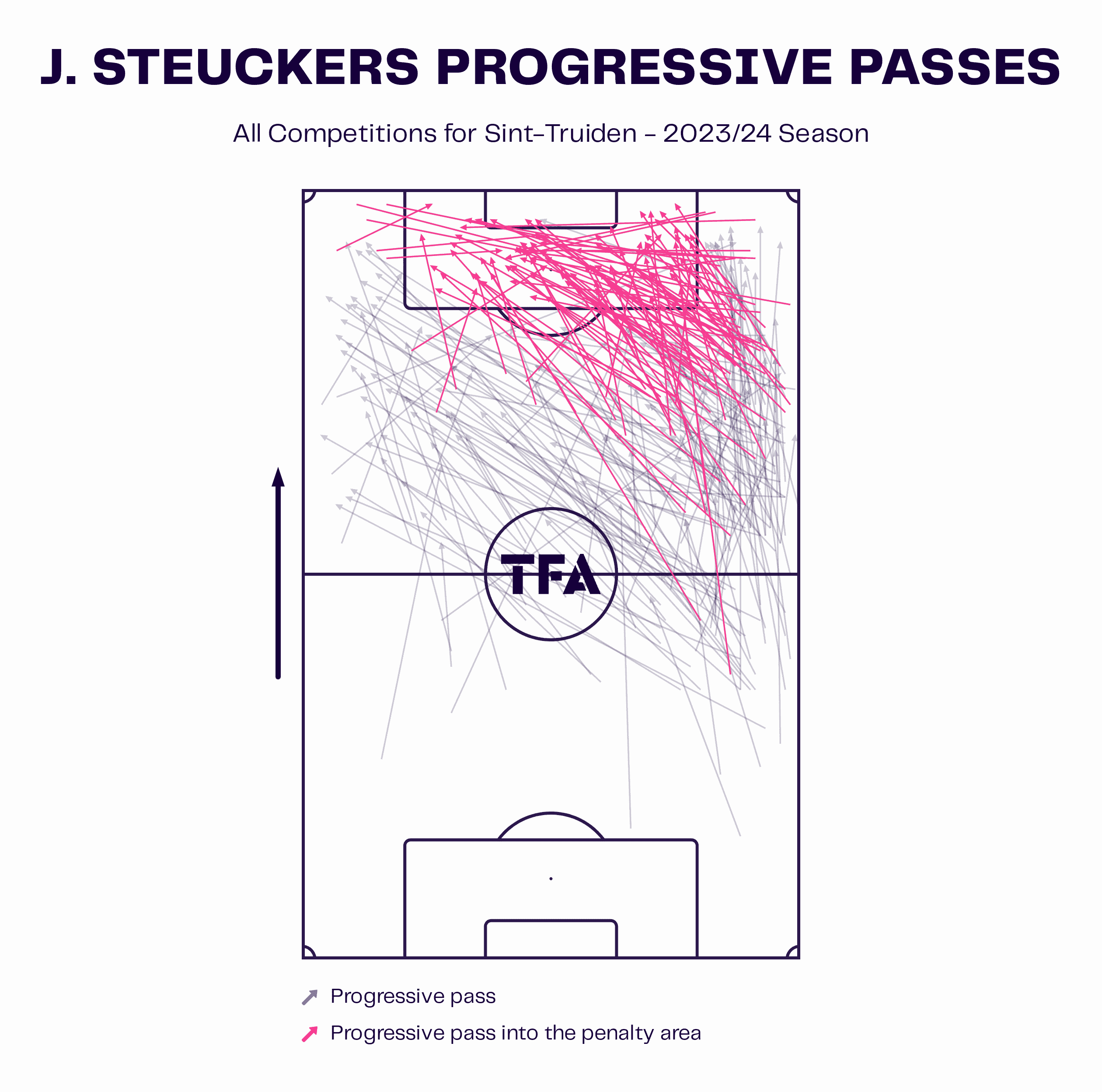 When diving a little bit deeper into the passing range and ability of Steuckers in the attacking half of the pitch, let us take a look at the data viz graphic shown above. We can see how impactful Steuckers has been for Sint-Truiden in the final third, with most of his progressive passes into the penalty area occurring either in the wide channel, or from the half-space. For Sint-Truiden this season, Steuckers averaged 6.78 passes to the final third per 90 minutes, with a success rate of 67.9%. Also, the Belgian averaged 6.12 passes to the penalty area per 90 minutes, with a success rate of 54.5%.