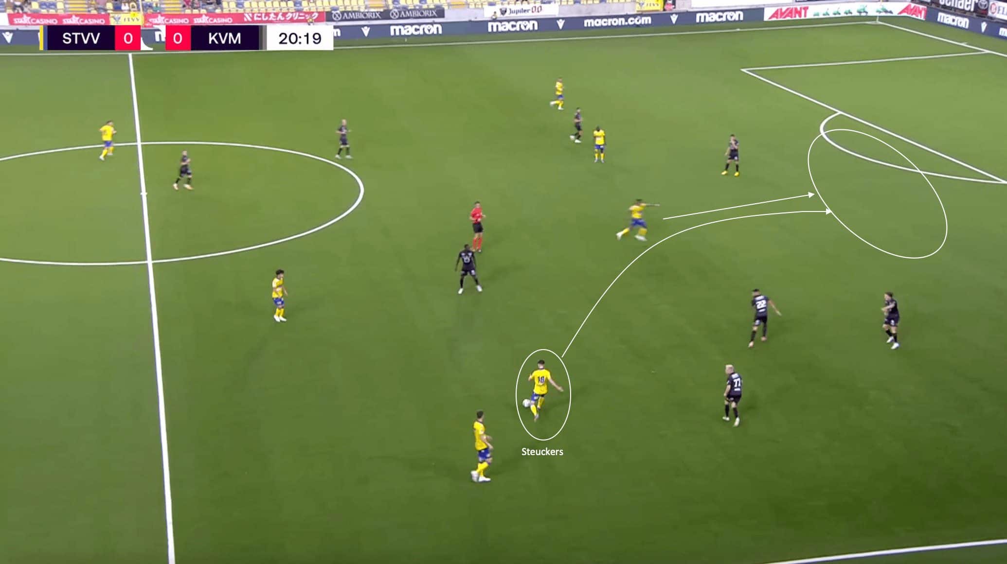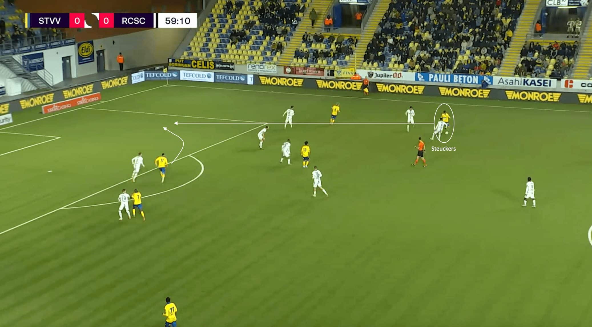 We can see from the figure above how often Steuckers looked to operate in the half-spaces for Sint-Truiden. In this phase of play above, the Belgian youth international received possession in the half-space from the wing-back, with Steuckers able to operate in space due to the opposition defence dropping off to attempt to protect the space behind.