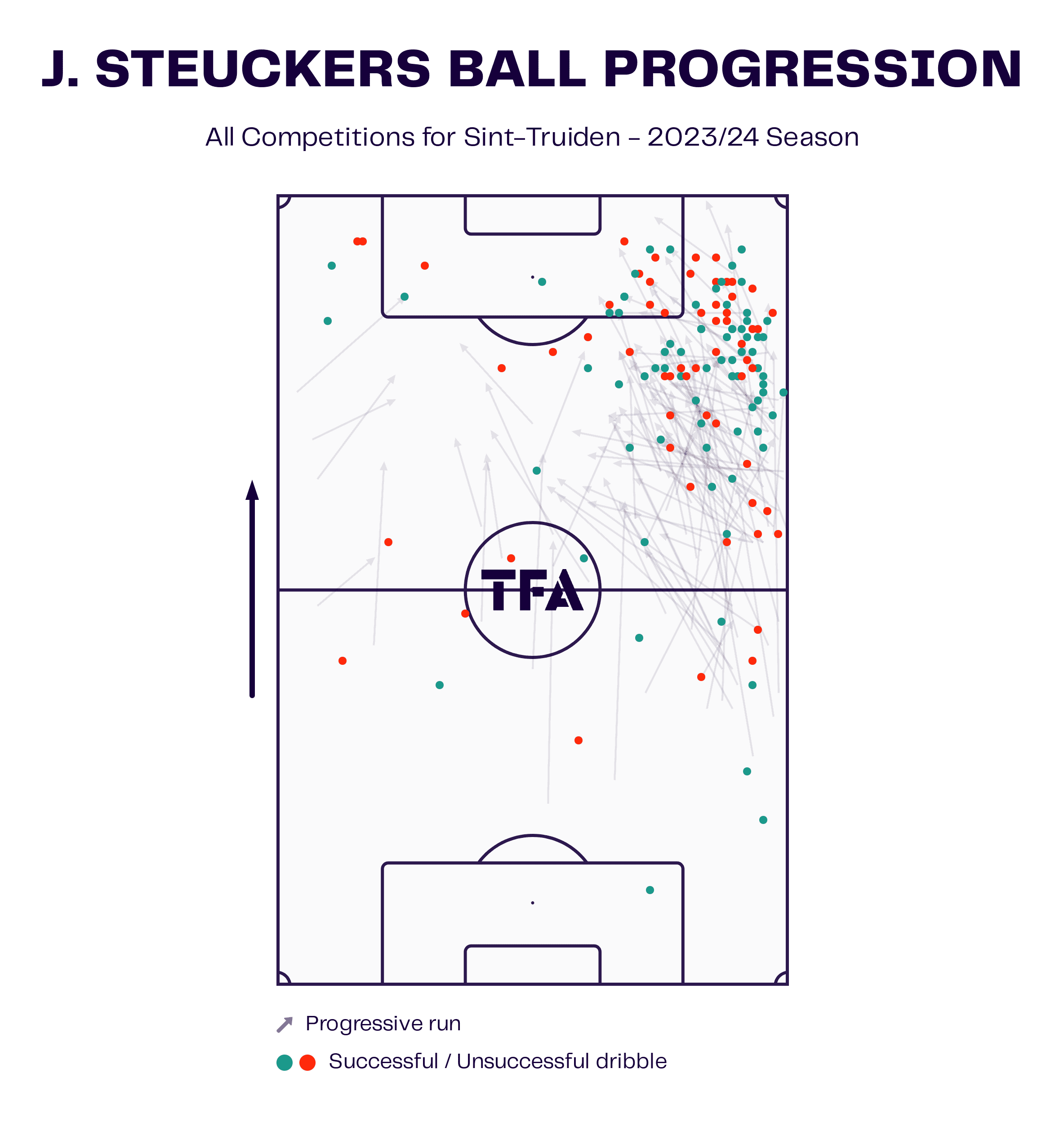 The data viz graphic above shows the ball progression of Steuckers last season in all competitions with Sint-Truiden. The 22-year-old tends to pick up possession in the attacking half of the pitch, usually in the wide channel and then looks to drive inside towards the half-space and the edge of the penalty area. Under Thorsten Fink, Steuckers usually tended to play as an inverted attacking midfielder/winger, with him starting on the right but being left-footed. This allows him to come into the half-space more to combine with teammates, but it also allows him to cut inside and take defenders on before taking shots on goal or crossing back post with his favoured left foot.