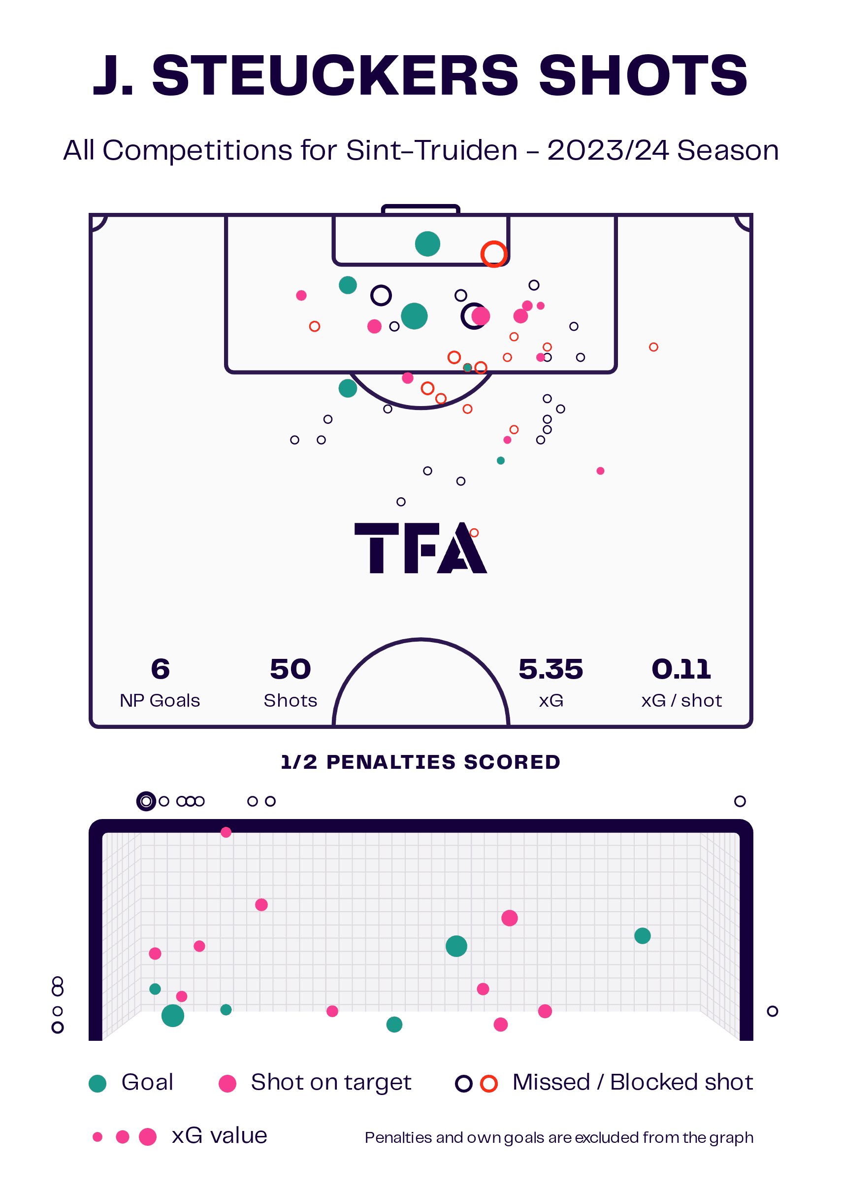 A strength that is continuing to improve in Steuckers’s skillset is his goalscoring threat in front of goal. The 22-year-old is now having back-to-back seasons of getting close to reaching double-digit goals. The Belgian youth international finished with seven goals in all competitions for Sint-Truiden this season, though they did not necessarily attempt many shots. Steuckers averaged only 1.51 shots per 90 minutes this season, with only 34.6% being on target.