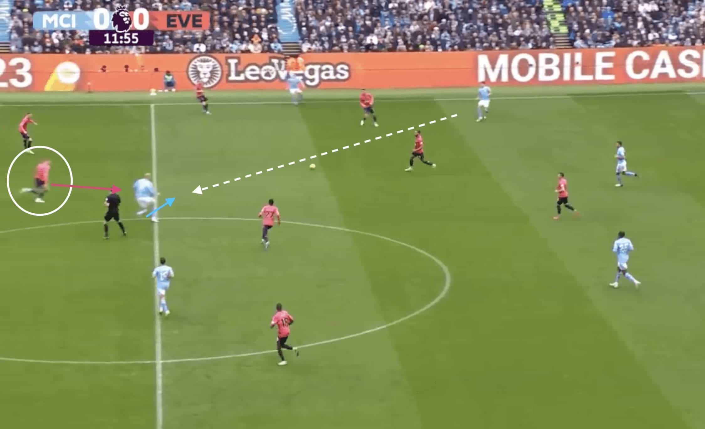 As shown in the image below, even when tasked with containing world-class strikers like Erling Haaland, Branthwaite is incredibly comfortable shadowing the forward’s movement and enjoys being tight enough to use his imposing frame to gain an edge over the striker.