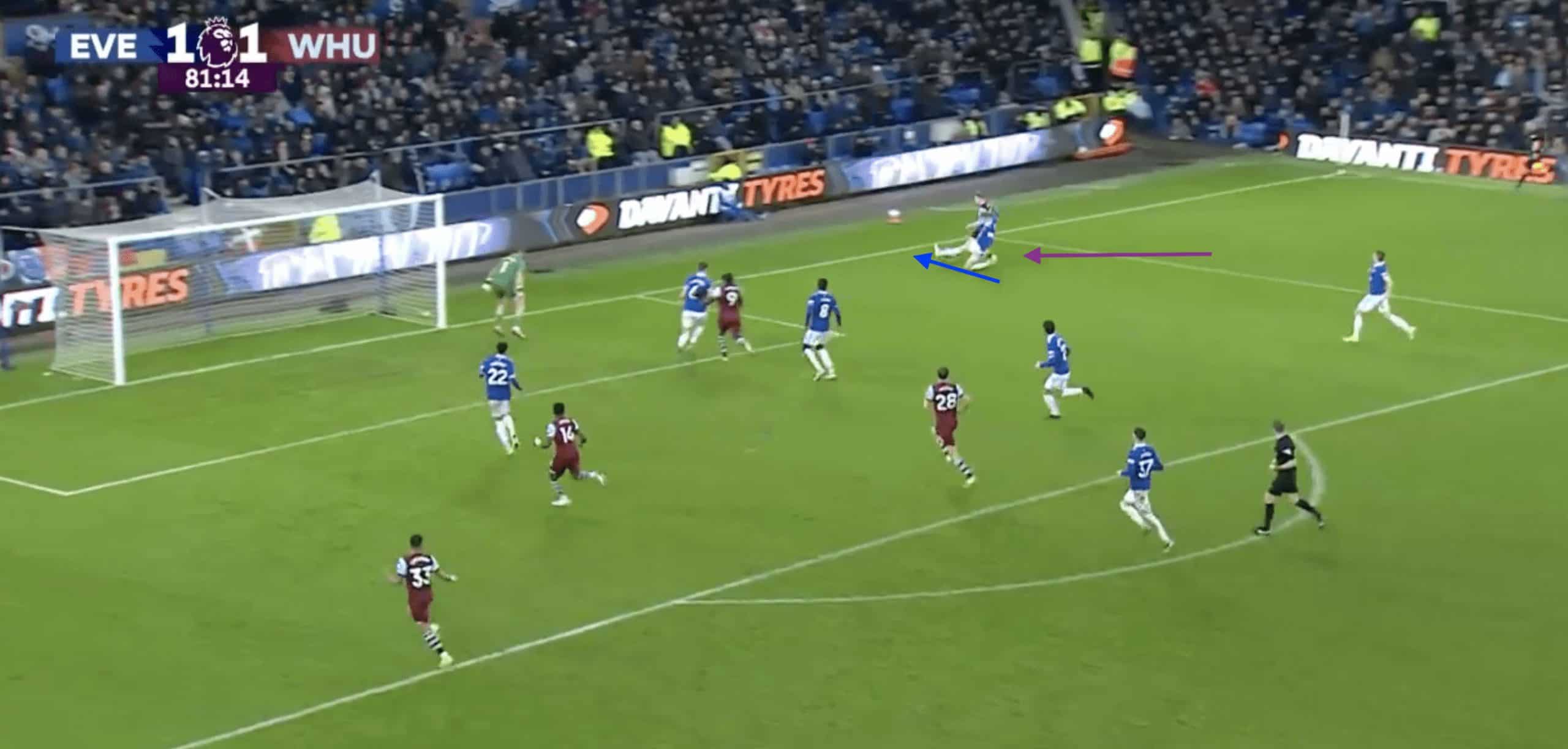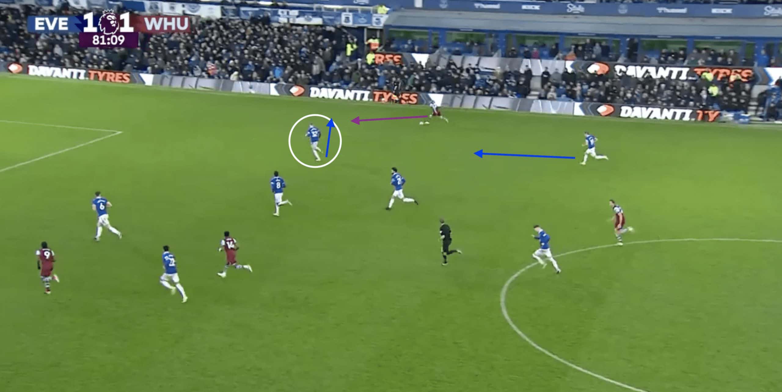 His explosive pace and extended reach are not normally highlighted as much when Everton sits deeper but are extremely crucial when having to recover in transition.