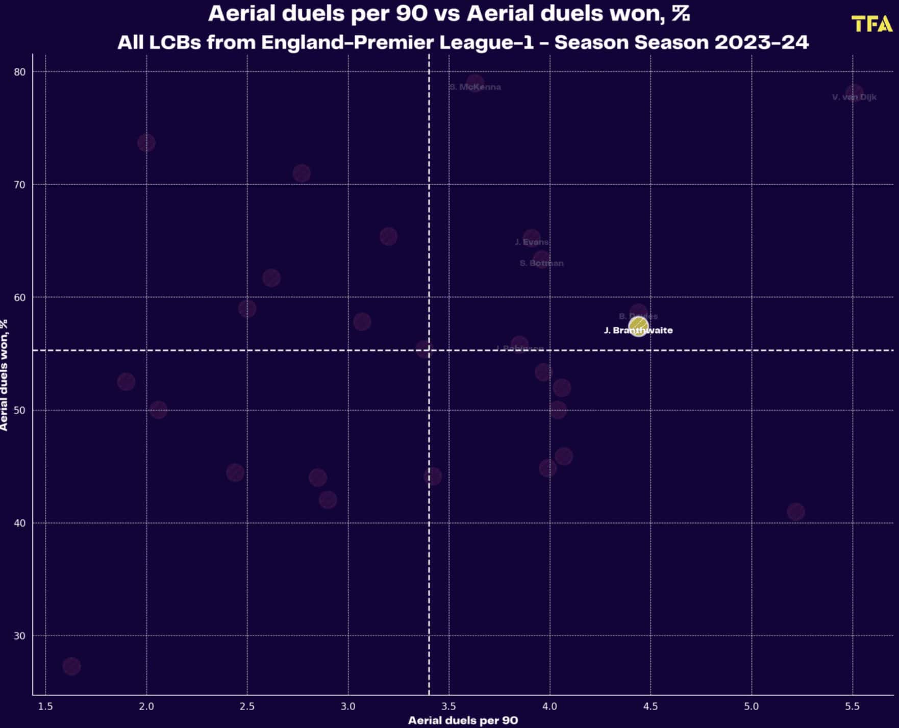 This complements the attributes of Branthwaite very nicely, who has been proficient in the air not only due to his increased verticality but also his ability to clear the ball from potential danger.