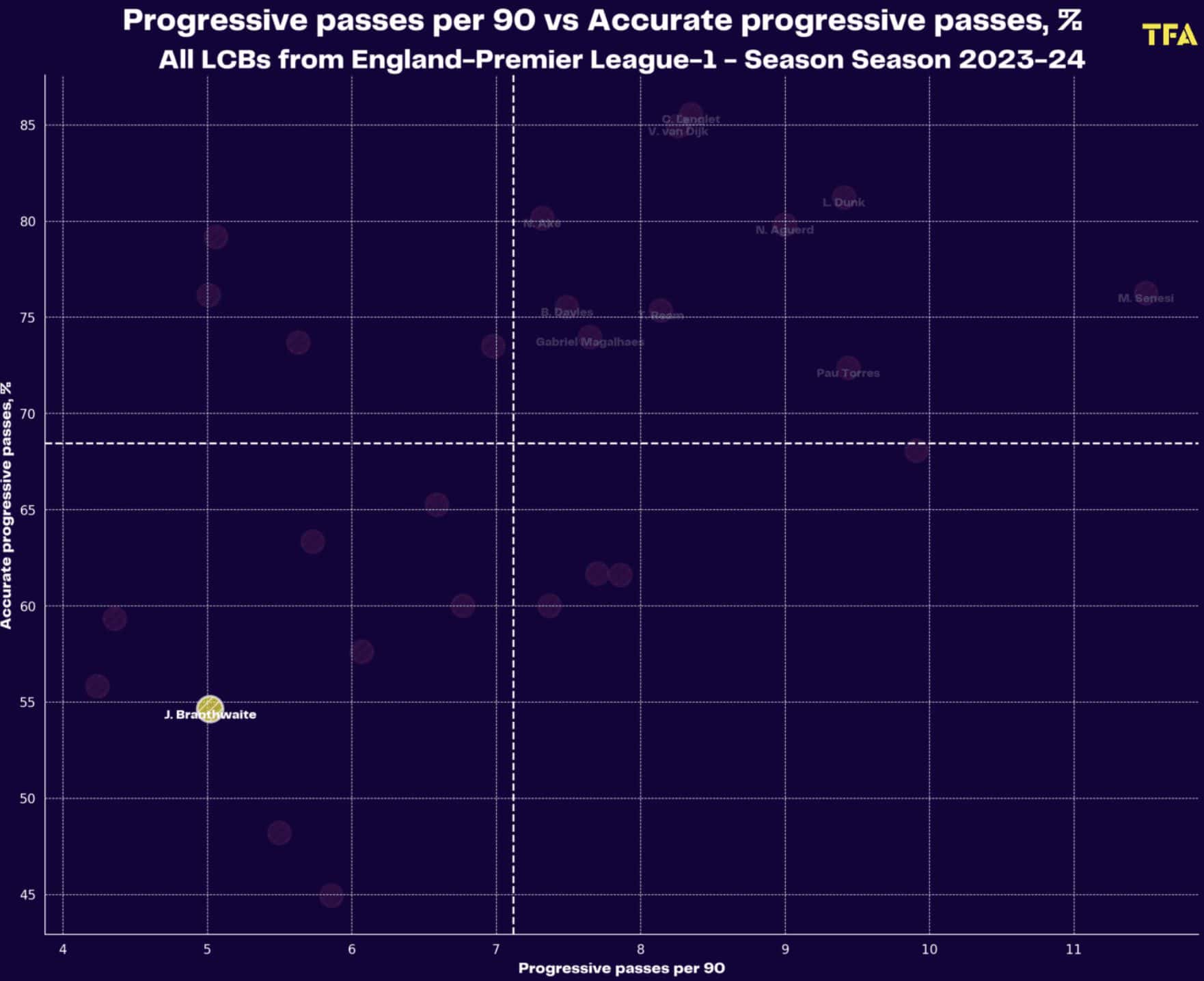Partially resulting from his team’s direct style forcing the ball out quickly and a lack of elite composure on the ball, Branthwaite’s long passing completion only stands at 52.3% (35th percentile for Premier League centre-backs).