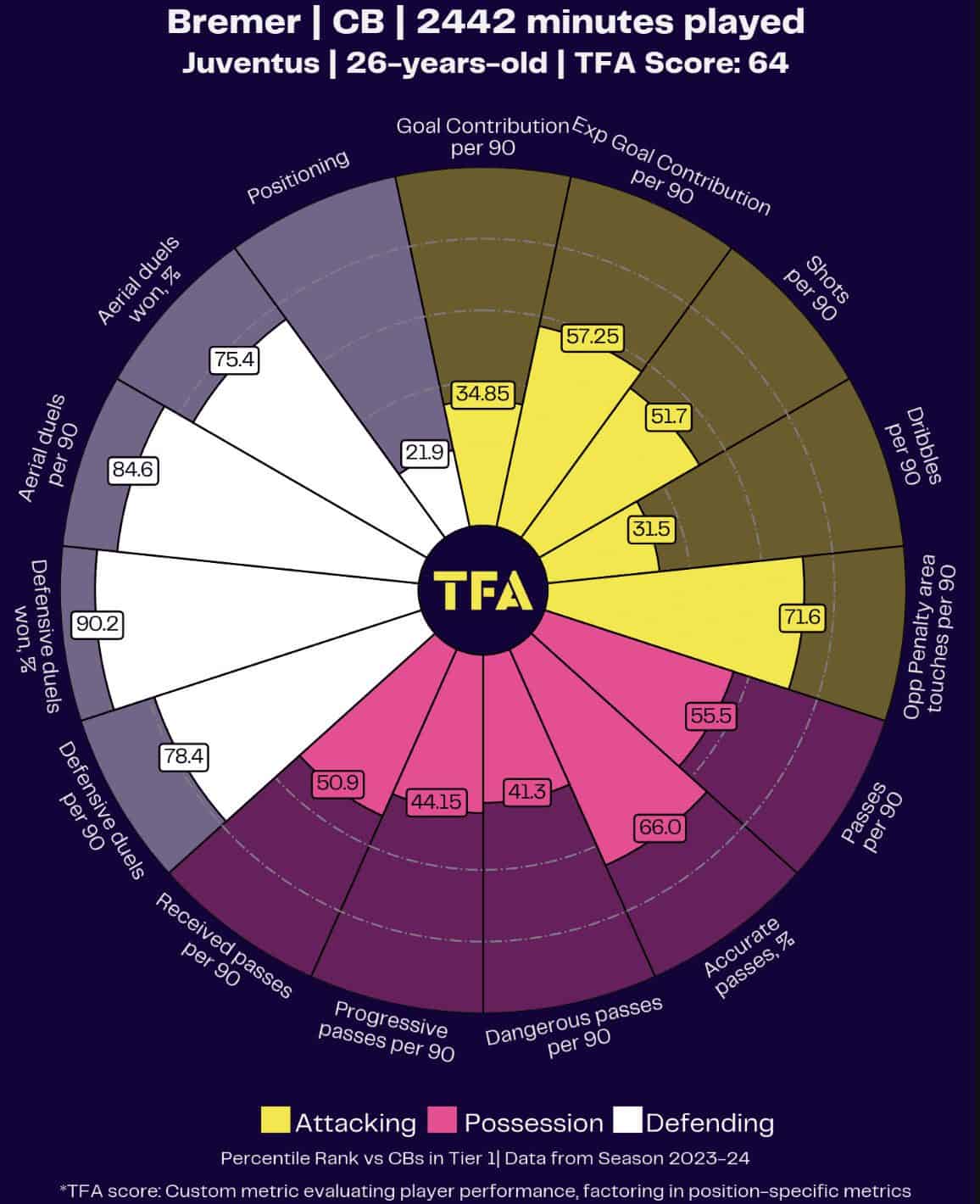 We identified that Gleison Bremer from Juventus was of a similar style to Branthwaite, although Bremer certainly appears to excel in offensive progression with increased experience at an elite club.