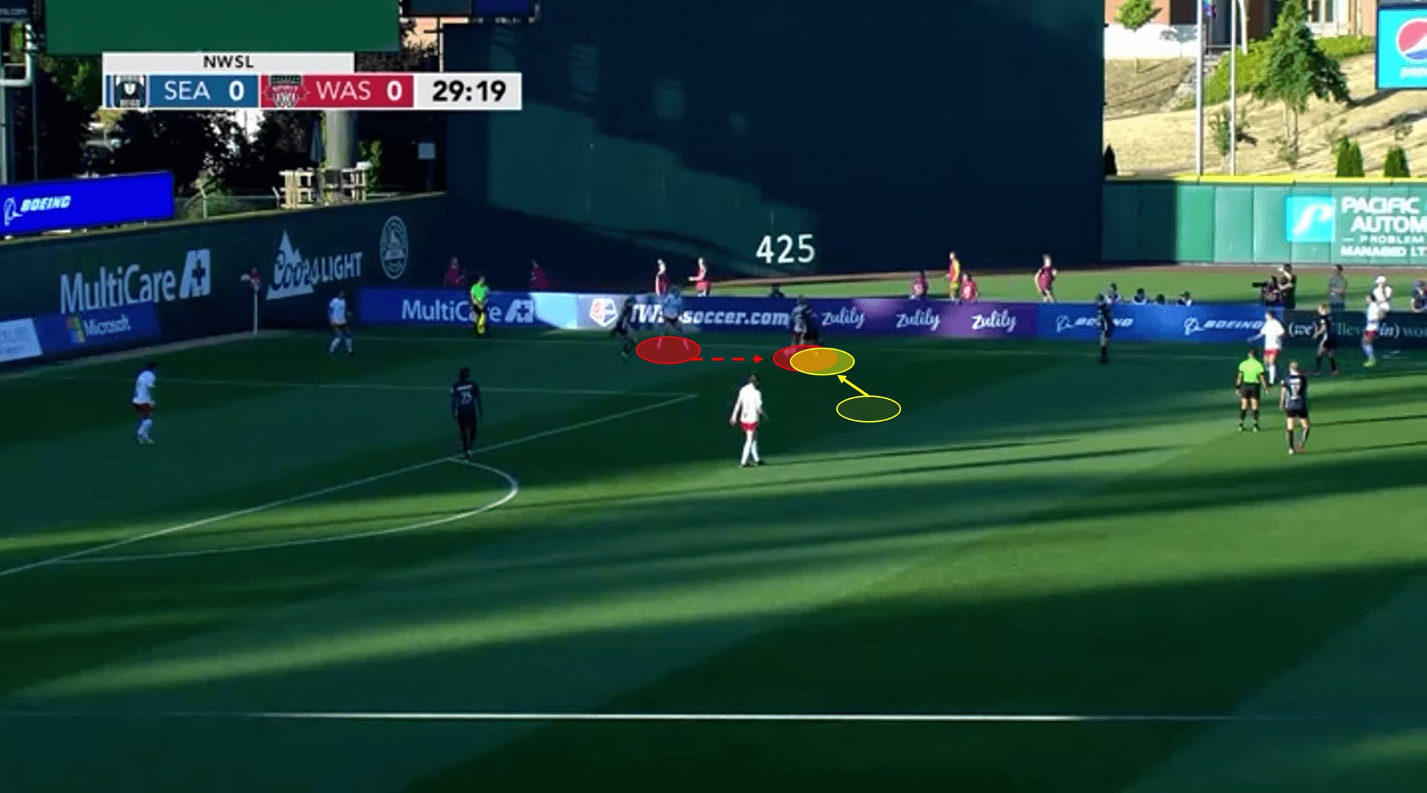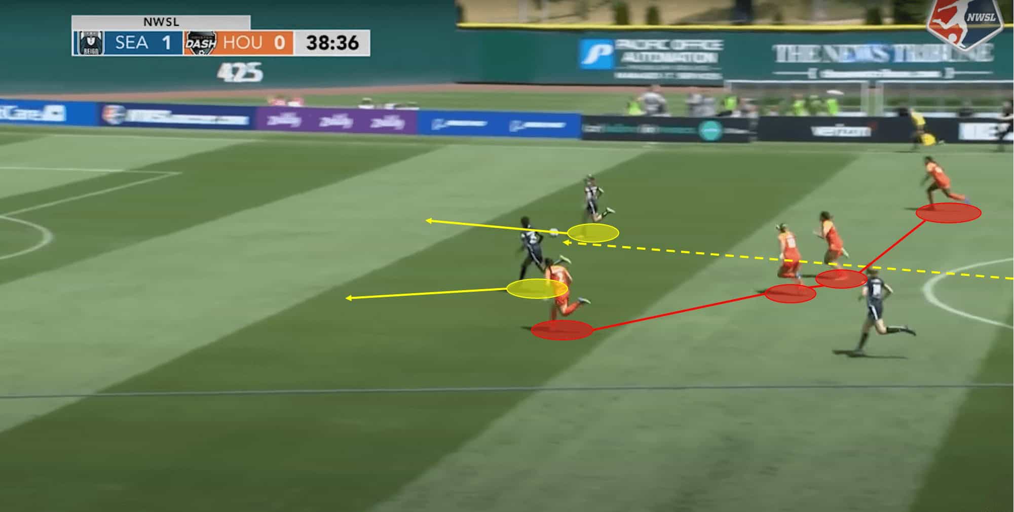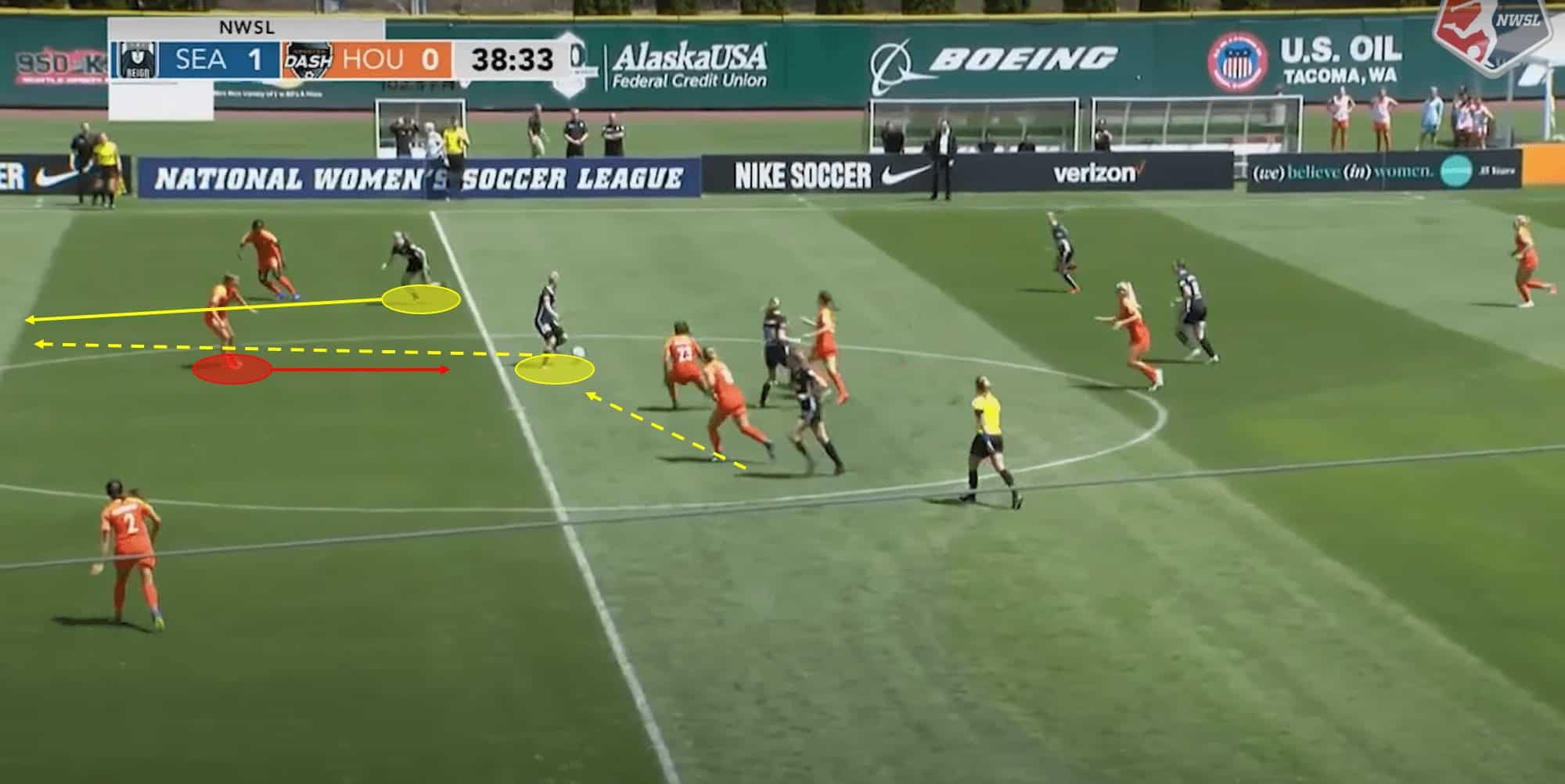 In Reign’s match against the Houston Dash, Fishlock has a moment in which she receives the ball with her back square to the opponent goal. Crucially, Fishlock has scanned the area behind her and is aware that fellow attacker Shea Groom is in position to accelerate forward into space. Fishlock is also aware that by receiving with her back to goal, she will trigger pressure from the Dash centre-back.