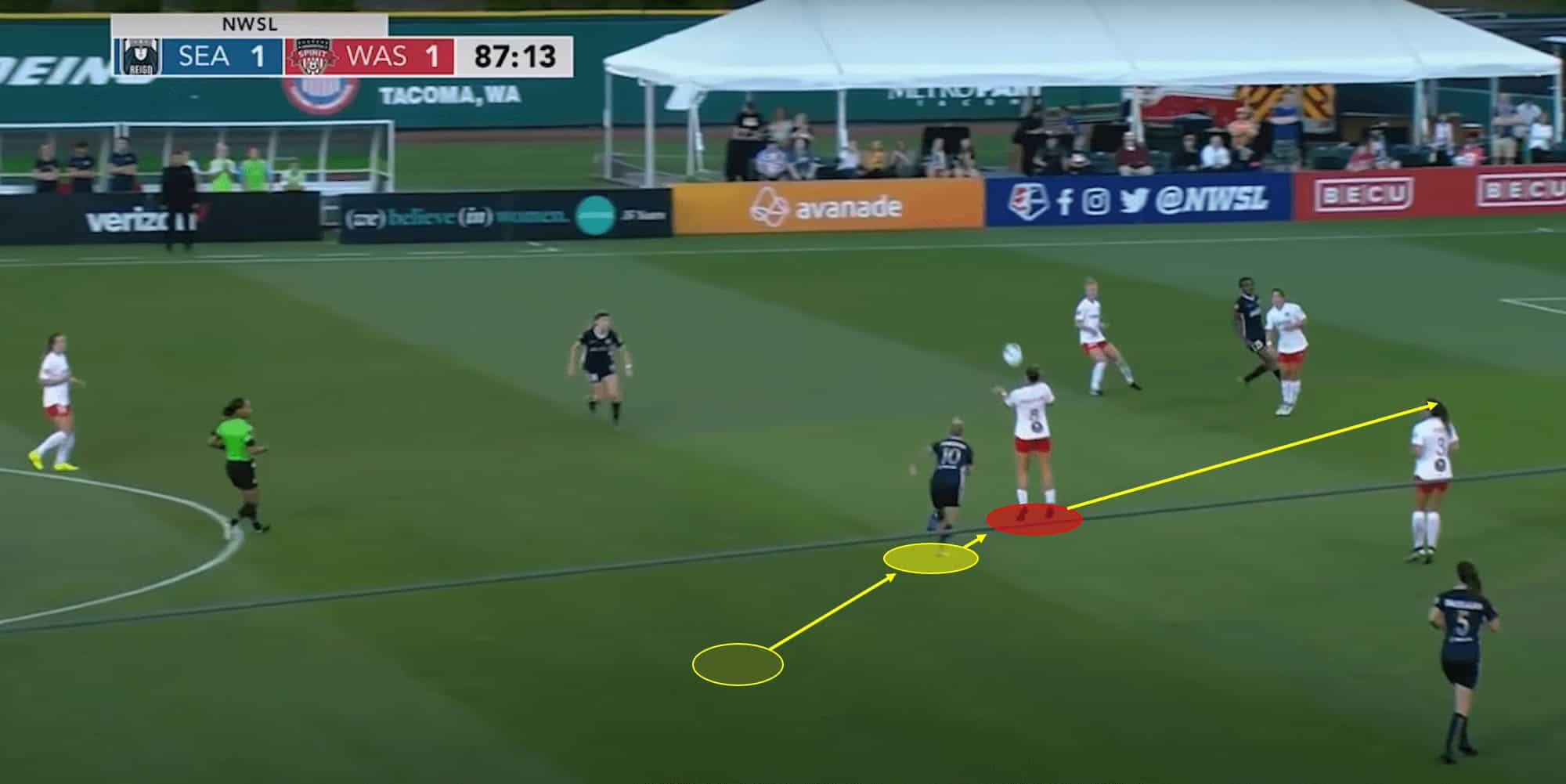This is a testament to her high level of scanning and subsequent awareness of attacking spaces on the pitch. This vision paired with the technical ability to place the ball exactly where she wanted with the correct pace, helped to create many goal-scoring chances for Reign.