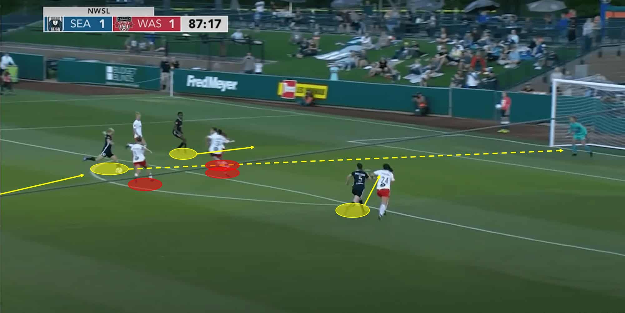 In Reign’s match against the Washington Spirit, we see an example of this late in the match. A Spirit midfielder is attempting to control an aerial ball in the central channel. As the ball is in the air, Fishlock is already in a full sprint, approaching the opponent from behind.