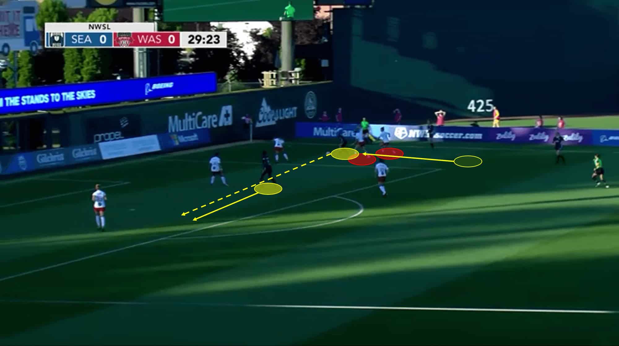 Upon receiving the ball, Fishlock does not take time to scan the area (because she already has) and immediately pivots her body to release a through ball into the space behind the Dash defensive line. In a matter of seconds, Fishlock has pulled a defender out of critical central space and placed the ball into that space for her attacking teammate.
