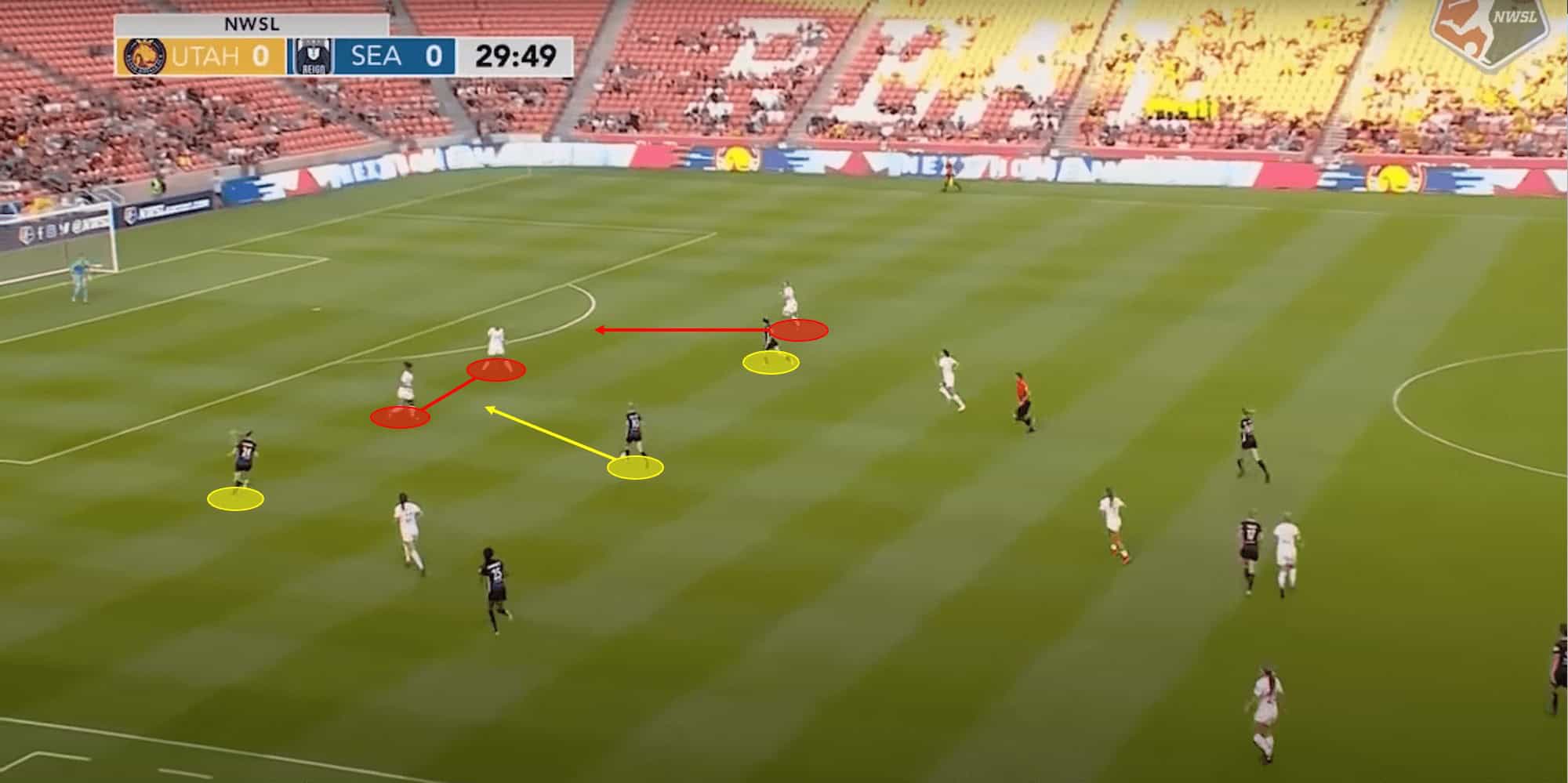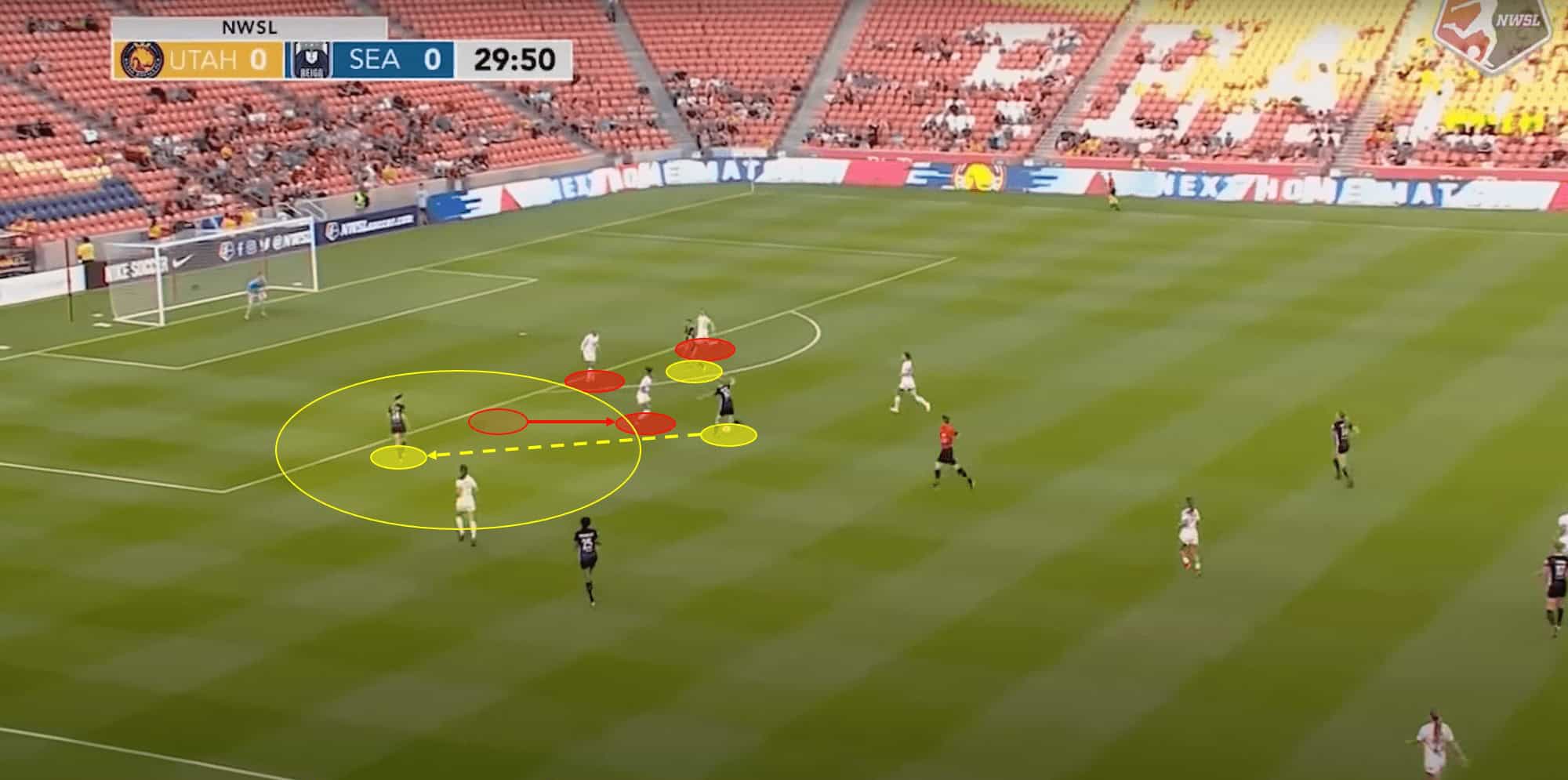 The Royals centre-back goes with the latter choice and closes down Fishlock. This pressuring movement opens up a large amount of attacking space for Reign attacker Balcer. Fishlock waits until the last possible moment and releases the ball to the feet of Balcer.