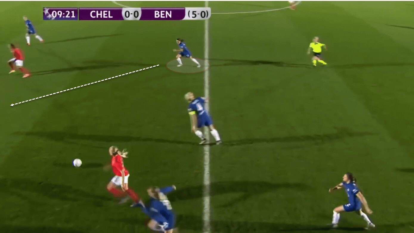 She covers the ground incredibly quickly and puts herself in a position to engage and win the ball. Another example can be seen here where Fleming sees Benfica playing a pass beyond centre-back Millie Bright. From here she wants to attack the space and intended receiver providing support in the defensive third.